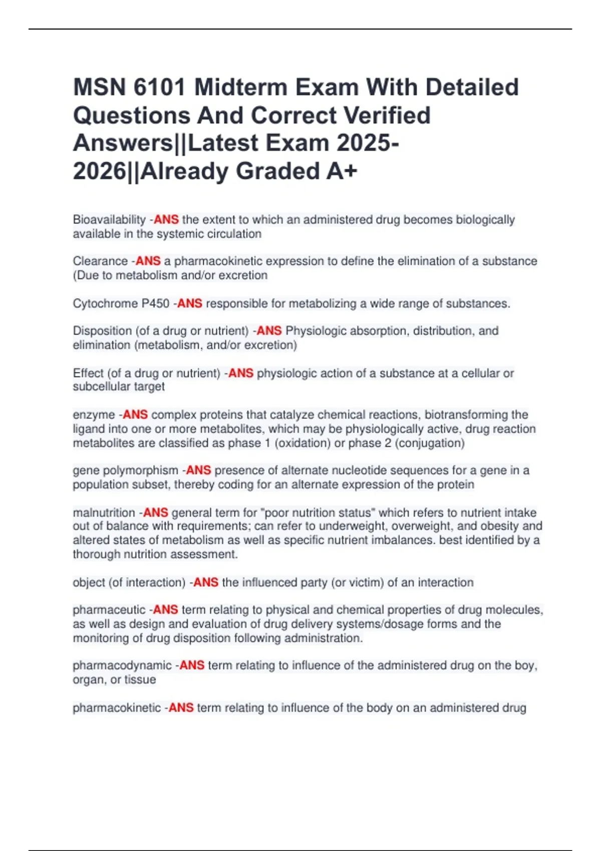 Welcome to MasterDocs Official Store — your ultimate destination for verified exam papers, detailed study guides, and high-quality notes trusted by hundreds of students worldwide. I specialize in providing accurate, well-organized, and up-to-date exam materials that help students study smarter, not harder. Each document is carefully reviewed, clearly formatted, and packed with questions and verified answers from recent exams to ensure top performance and confidence on test day. Whether you're preparing for university finals, nursing boards, accounting tests, healthcare management exams, or TEAS/NCLEX practice, you’ll find the exact material you need — concise, reliable, and results-driven. ✅ Why Students Choose My Docs: Verified answers and updated content Professionally formatted for quick review Guaranteed accuracy and clarity Affordable prices for premium quality 100% student satisfaction