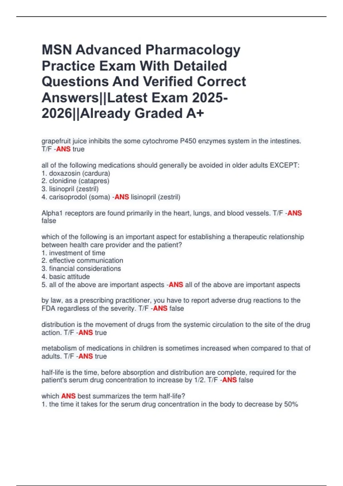 MSN Advanced Pharmacology Practice Exam With Detailed Questions And Verified Correct Answers||Latest Exam ||Already Graded A+