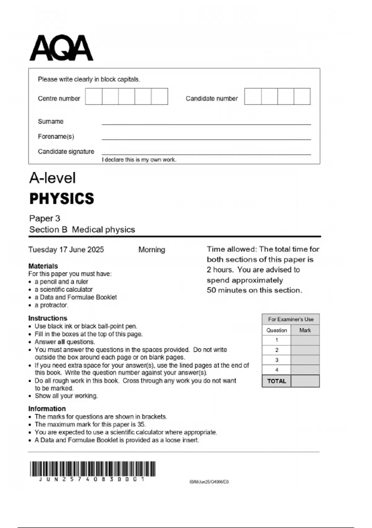 actual aqa a level physics paper 3 section b (medical physics ) 2025