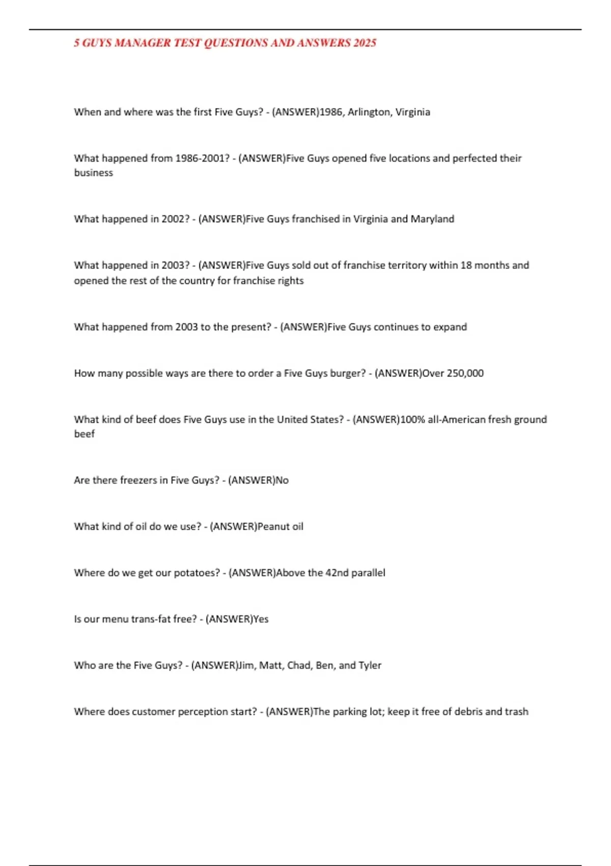 5 GUYS MANAGER TEST QUESTIONS AND ANSWERS 2025
