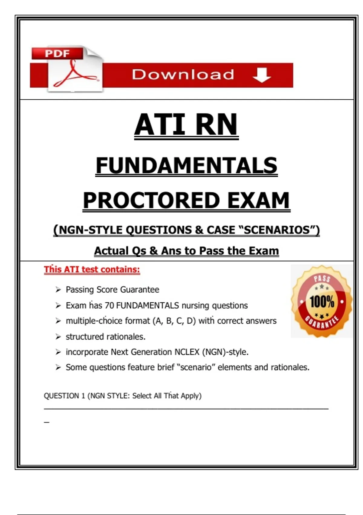 INSTANT PDF DOWNLOAD — FULL PRACTICE SET — 70+ QUESTIONS & RATIONALES This comprehensive practice resource for the ATI RN Fundamentals Proctored Exam contains exam-style questions, NGN clinical judgment scenarios, and structured rationales designed to help nursing students strengthen core fundamentals, build critical-thinking skills, and prepare confidently for ATI testing.