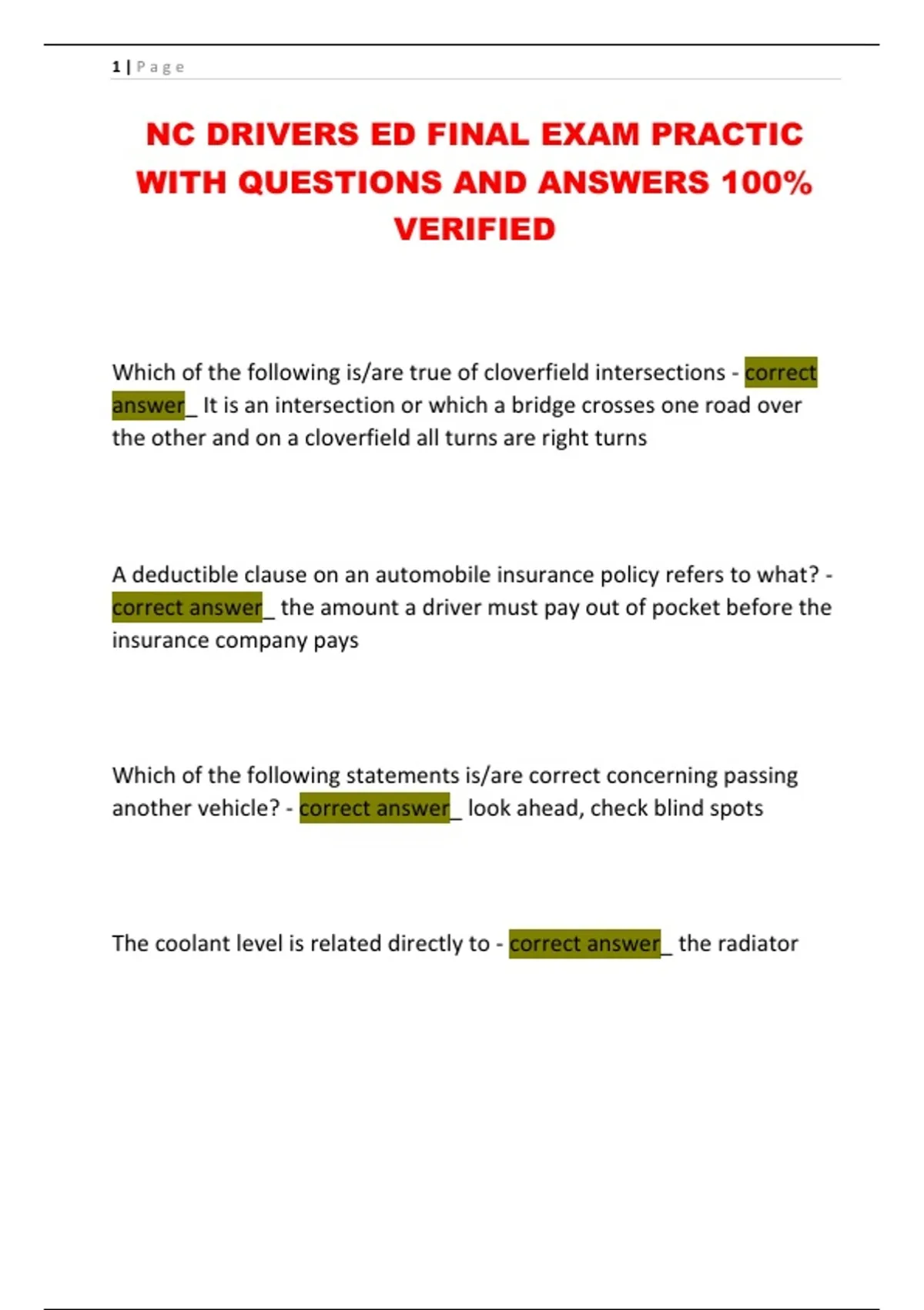 NC DRIVERS ED FINAL EXAM PRACTIC WITH QUESTIONS AND ANSWERS 100% VERIFIED