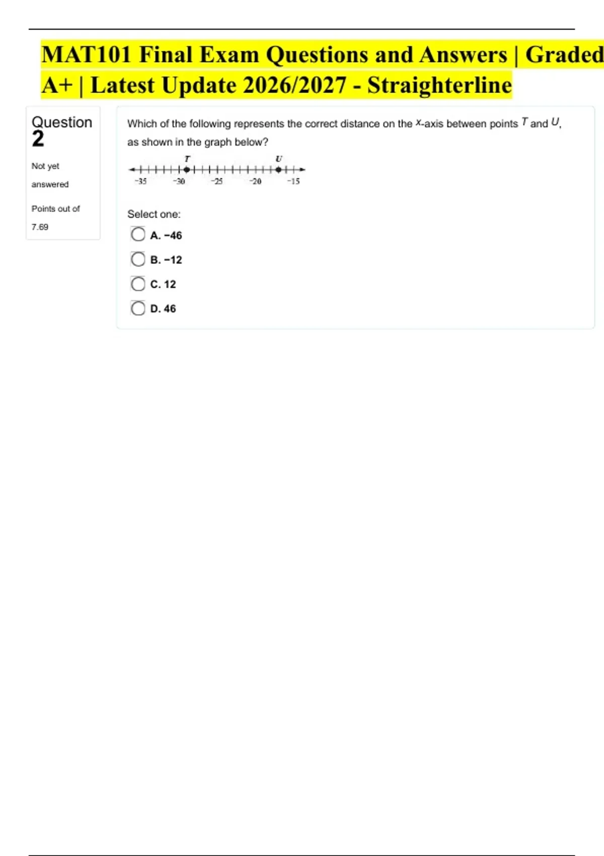 Question Which of the following represents the correct distance on the x-axis between points T and U,
