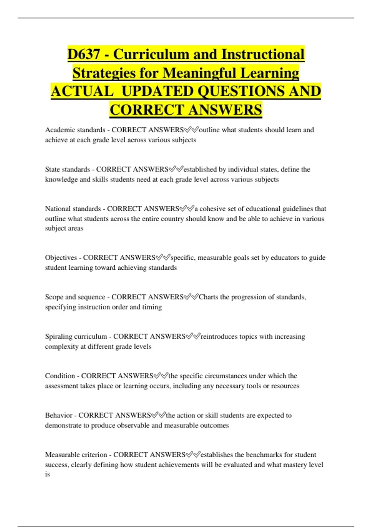 D637 - Curriculum and Instructional Strategies for Meaningful Learning ACTUAL UPDATED QUESTIONS AND CORRECT ANSWERS Academic standards - CORRECT ANSWERSoutline what students should learn and achieve at each grade level across various subjects State standards - CORRECT ANSWERSestablished by individual states, define the knowledge and skills students need at each grade level across various subjects National standards - CORRECT ANSWERSa cohesive set of educational guidelines that outline what students across the entire country should know and be able to achieve in various subject areas Objectives - CORRECT ANSWERSspecific, measurable goals set by educators to guide student learning toward achieving standards Scope and sequence - CORRECT ANSWERSCharts the progression of standards, specifying instruction order and timing Spiraling curriculum - CORRECT ANSWERSreintroduces topics with increasing complexity at different grade levels Condition - CORRECT ANSWERSthe specific circumstances under which the assessment takes place or learning occurs, including any necessary tools or resources Behavior - CORRECT ANSWERSthe action or skill students are expected to demonstrate to produce observable and measurable outcomes Measurable criterion - CORRECT ANSWERSestablishes the benchmarks for student success, clearly defining how student achievements will be evaluated and what mastery level is Direct instruction - CORRECT ANSWERSA structured, teacher-led approach to teaching focused on clear instructions and learning expectations Indirect instruction - CORRECT ANSWERSA learner-centered approach emphasizing higher levels of learner involvement, such as problem-solving, case studies, and critical thinking Discovery/experiential learning - CORRECT ANSWERSlearning strategies involving students in active engagement through real-world experiences, exploration, and reflection Role play - CORRECT ANSWERSstudents step into the shoes of others, acting out scenarios that require them to navigate through problems and perspectives that are not their own Simulations - CORRECT ANSWERSRecreating complex real-world processes