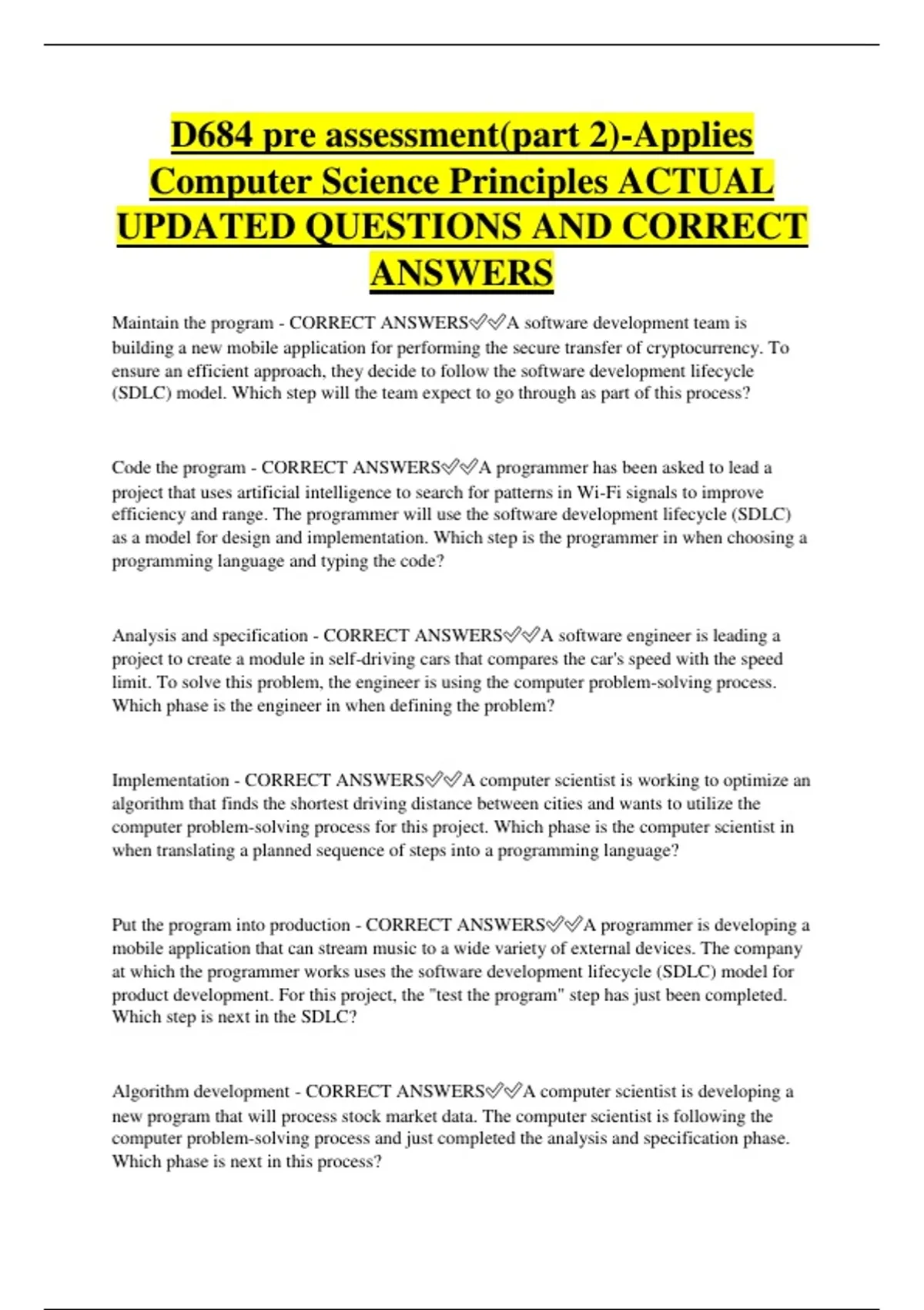 D684 pre assessment(part 2)-Applies Computer Science Principles ACTUAL UPDATED QUESTIONS AND CORRECT ANSWERS Maintain the program - CORRECT ANSWERSA software development team is building a new mobile application for performing the secure transfer of cryptocurrency. To ensure an efficient approach, they decide to follow the software development lifecycle (SDLC) model. Which step will the team expect to go through as part of this process? Code the program - CORRECT ANSWERSA programmer has been asked to lead a project that uses artificial intelligence to search for patterns in Wi-Fi signals to improve efficiency and range. The programmer will use the software development lifecycle (SDLC) as a model for design and implementation. Which step is the programmer in when choosing a programming language and typing the code? Analysis and specification - CORRECT ANSWERSA software engineer is leading a project to create a module in self-driving cars that compares the car's speed with the speed limit. To solve this problem, the engineer is using the computer problem-solving process. Which phase is the engineer in when defining the problem? Implementation - CORRECT ANSWERSA computer scientist is working to optimize an algorithm that finds the shortest driving distance between cities and wants to utilize the computer problem-solving process for this project. Which phase is the computer scientist in when translating a planned sequence of steps into a programming language? Put the program into production - CORRECT ANSWERSA programmer is develop