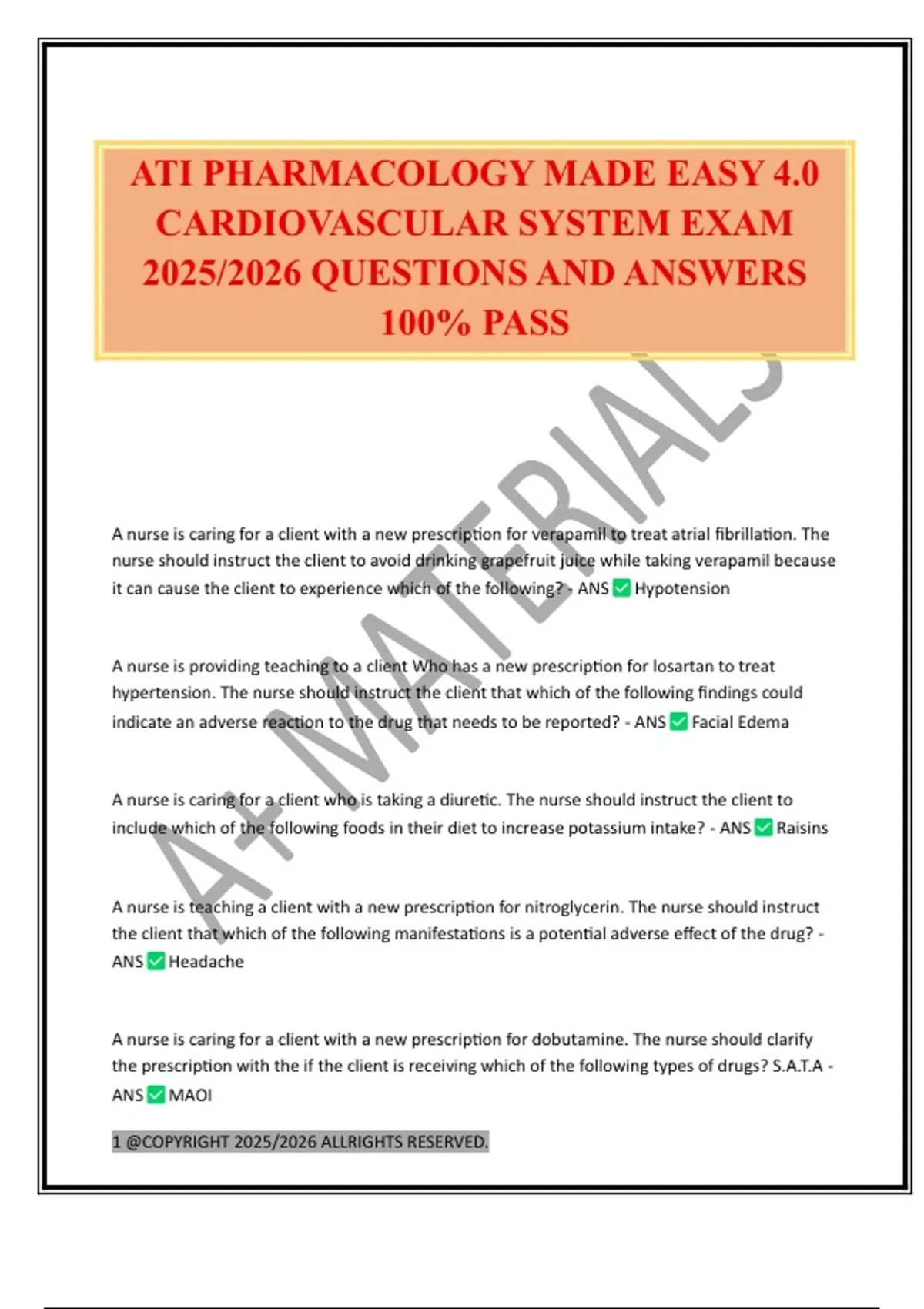 ATI PHARMACOLOGY MADE EASY 4.0 CARDIOVASCULAR SYSTEM EXAM 2025/2026 QUESTIONS AND ANSWERS 100% PASS