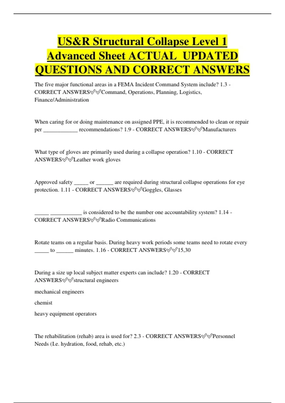US&R Vehicle Rescue Level 1&2 ACTUAL UPDATED QUESTIONS AND CORRECT ANSWERS The _____ tool may be used with a variety of interchangeable bits and is well suited for cutting metal on/in vehicles? - CORRECT ANSWERSAir Chisel When using air lift bags, _____ is the maximum number of bags that should be stacked on top of one another? - CORRECT ANSWERS2 The _____ saw is most likely to be used for cutting laminated glass in vehicles? - CORRECT ANSWERSReciprocating A _____ is a portable cable/ chain winch operated by a manual ratchet. - CORRECT ANSWERSCome-along When using hydraulic cutters, it is critical to make the cut at _____ degrees to the material if possible. - CORRECT ANSWERS90 When using air lift bags, the bags reach maximum lifting capacity at _____. - CORRECT ANSWERS1 inch The formula used to determine the weight limit capacity of an airless bag is _____. - CORRECT ANSWERSL x W x P (operating pressure 118psi) The typical operation range in psi of the air chisel is _____. - CORRECT ANSWERS40 - 200psi With 4 x 4 cribbing, each intersection weighs _____ pounds. - CORRECT ANSWERS6000 Stabilization of the vehicle will provide _____. - CORRECT ANSWERSA solid foundation to work from. Lift an inch, _____ an inch. - CORRECT ANSWERSCrib Cribbing can be effectively used at a maximum of _____ times its length. - CORRECT ANSWERS1.5 When using dual airbags stacked on one another, you inflate the _____ airbag first. -