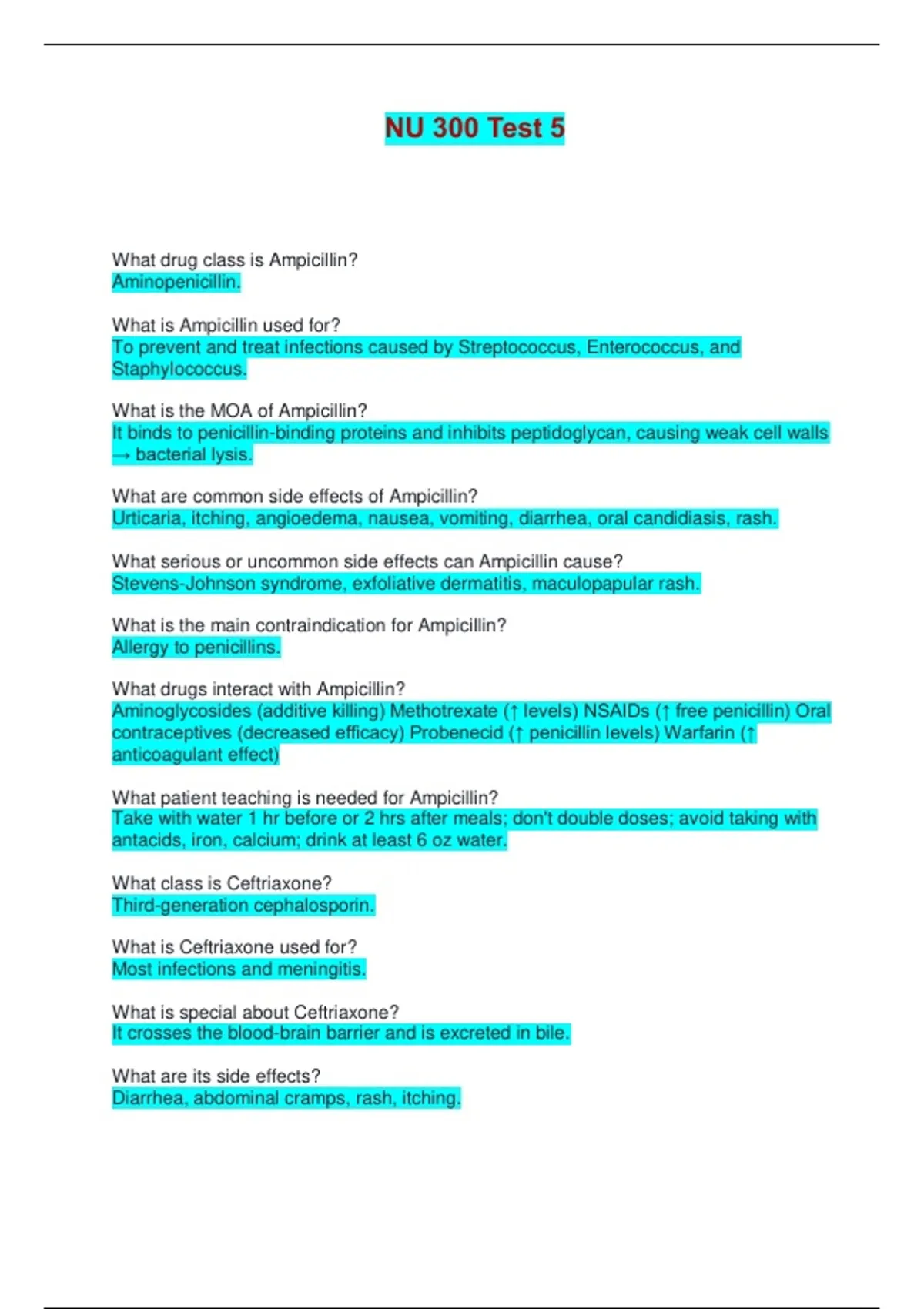 NU 300 Test 5 | Complete Solutions (Verified Answers) What drug class is Ampicillin? Aminopenicillin. What is Ampicillin used for? To prevent and treat infections caused by Streptococcus, Enterococcus, and Staphylococcus. What is the MOA of Ampicillin? It binds to penicillin-binding proteins and inhibits peptidoglycan, causing weak cell walls → bacterial lysis. What are common side effects of Ampicillin? Urticaria, itching, angioedema, nausea, vomiting, diarrhea, oral candidiasis, rash. What serious or uncommon side effects can Ampicillin cause? Stevens-Johnson syndrome, exfoliative dermatitis, maculopapular rash. What is the main contraindication for Ampicillin? Allergy to penicillins. What drugs interact with Ampicillin? Aminoglycosides (additive killing) Methotrexate (↑ levels) NSAIDs (↑ free penicillin) Oral contraceptives (decreased efficacy) Probenecid (↑ penicillin levels) Warfarin (↑ anticoagulant effect) What patient teaching is needed for Ampicillin? Take with water 1 hr before or 2 hrs after meals; don't double doses; avoid taking with antacids, iron, calcium; drink at least 6 oz water. What class is Ceftriaxone? Third-generation cephalosporin. What is Ceftriaxone used for? Most infections and meningitis. What is special about Ceftriaxone? It crosses the blood-brain barrier and is excreted in bile. What are its side effects? Diarrhea, abdominal cramps, rash, itching. What patients cannot receive Ceftriaxone? Hyperbilirubinemic neonates or severe liver dysfunction. What can Ceftriaxone NOT be given with? Calcium infusions. Teaching for Ceftriaxone? Given IM/IV once daily; avoid alcohol; do not mix with calcium. What class is Imipenem/Cilastatin? Carbapenem. Why is Imipenem known? Broadest antibacterial spectrum available. What is Imipenem used for? Bone, joint, skin, soft tissue infections; endocarditis; intra-abdominal infections; UTIs; pneumonia; septicemia. MOA of Imipenem? Binds to PBPs → inhibits bacterial cell wall synthesis. Major side effect? Seizures. Drug interactions? Cyclosporine, ganciclovir, probenecid (↑ seizure risk). What class is Vancomycin? Glycopeptide. What is Vancomycin used for? MRSA, C. diff (oral), bone/joint infections, bloodstream infections. MOA for Vancomycin? Destroys bacteria by inhibiting cell wall synthesis. Major side effects? Ototoxicity, nephrotoxicity, Red Man Syndrome, hypotension. What increases nephrotoxicity with Vancomycin? Aminoglycosides, cyclosporine, contrast media. What should nurses check? Trough levels 30 min before next dose; renal function; BP; hearing. What class is Doxycycline? Tetracycline. What is Doxycycline used for? Rocky Mountain spotted fever, chlamydia, mycoplasma, acne. Major side effects of Doxycycline? Photosensitivity, tooth discoloration in kids, slowed fetal bone growth. What decreases absorption? Calcium, iron, magnesium, dairy. Teaching for Doxycycline? Avoid sun, take with water, avoid dairy/antacids/iron 2-3 hours apart. What class is Azithromycin? Macrolide. What is it used for? Respiratory, GI, skin, GU infections; MAC. Major side effects? QT prolongation, palpitations, GI upset, hepatotoxicity, hearing loss. Important interactions? Warfarin, cyclosporine, theophylline (all compete for liver metabolism). Teaching? Don't take with fruit juices; report chest pain, dizziness, jaundice, rash. What class is Clindamycin? Lincosamide. What is it used for? Bone infections, abdominal infections, pneumonia, septicemia, skin infections. Major side effect? C. diff (pseudomembranous colitis). Key interactions? Neuromuscular blockers (↑ paralysis). Teaching? Take with water; avoid alcohol-containing or abrasive skin products; avoid sex with vaginal form. What class is Linezolid? Oxazolidinone. What is Linezolid used for? VRE, MRSA skin infections, pneumonia. Major side effects of Linezolid? Nausea, diarrhea, headache, ↓ platelets. Dangerous interaction w/ Linezolid? SSRIs → serotonin syndrome; tyramine foods → hypertensive crisis. Teaching for Linezolid? Avoid aged cheeses, wine, soy; report fever, abdominal pain, diarrhea. What class is Gentamicin? Aminoglycoside. What is Gentamicin used for? Gram-negative infections and severe Staph. What is the therapeutic trough level for Gentamicin? <1 mcg/mL. What happens if trough >2 mcg/mL Gentamicin? ↑ risk of ototoxicity & nephrotoxicity. Major side effects of Gentamicin? Hearing loss, tinnitus, nephrotoxicity, dizziness, vertigo. Interactions of Gentamicin? Vancomycin (↑ nephrotoxicity) Loop diuretics (↑ ototoxicity) Warfarin (↑ effect) Neuromuscular blockers (↑ blockade) Teaching for Gentamicin? Drink 3 L/day; report headache, vertigo; watch for superinfections. Use of Cefazolin? Surgical prophylaxis, Staph infections. Contraindication of Cefazolin? Penicillin anaphylaxis. Interaction of Cefazolin? Alcohol (acute intolerance), oral contraceptives (decreased effect). Use of Cefuroxime? Broad spectrum, more gram-negative than 1st gen. What class is Isoniazid? First-line antimycobacterial. What is it used for Isoniazid? TB treatment & prevention. MOA of Isoniazid? Converted to isonicotinic acid → forms defective NAD → interrupts TB metabolism. Major adverse effects Isoniazid? Peripheral neuropathy, hepatotoxicity, optic neuritis, hyperglycemia. What vitamin must be given with Isoniazid? Vitamin B6 (pyridoxine). Black Box Warning for Isoniazid? Liver toxicity. Teaching for Isoniazid? Report jaundice, numbness/tingling, abdominal pain; may cause false-positive urine glucose; avoid alcohol. What is Amphotericin B used to treat? Amphotericin B treats systemic fungal infections like aspergillosis, candidiasis, cryptococcosis, and histoplasmosis. What is the mechanism of action of Amphotericin B? Amphotericin B binds to ergosterol in fungal cell membranes and creates pores that leak potassium and magnesium, causing cell death. What are the major side effects of Amphotericin B? Amphotericin B causes infusion reactions (fever, chills, tachycardia, hy