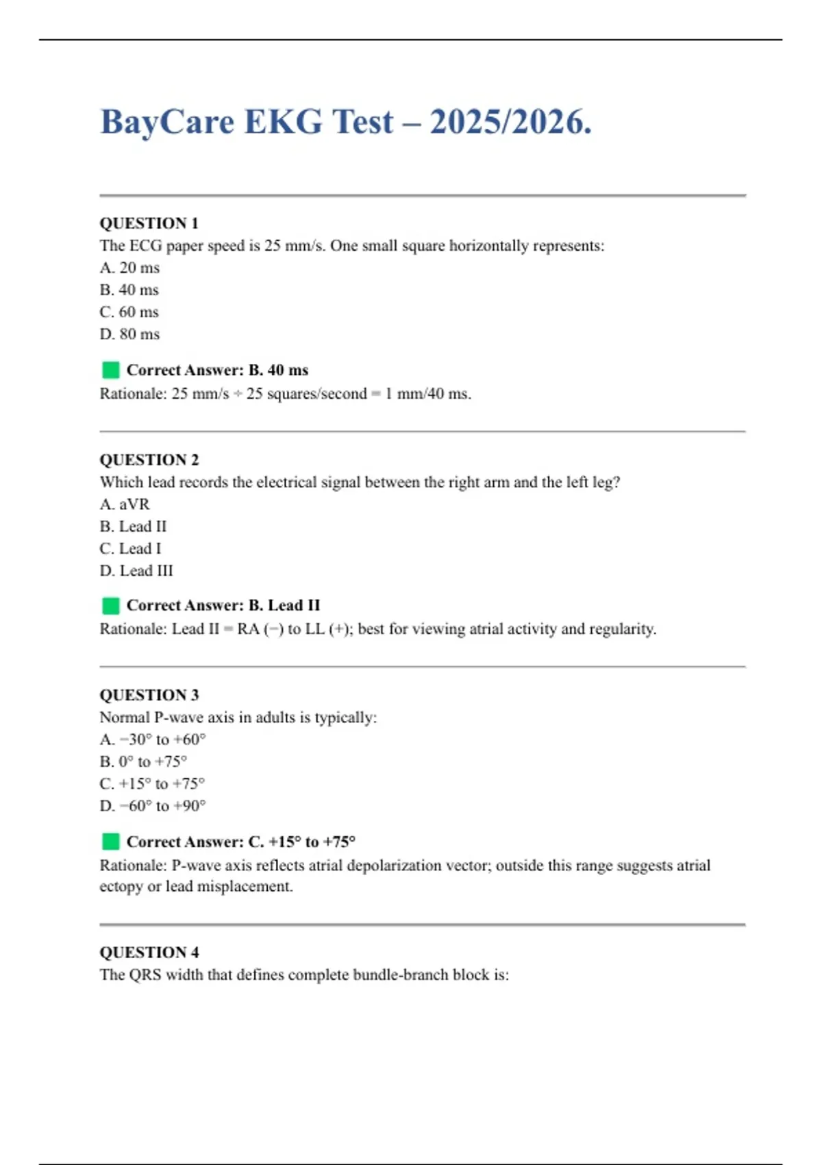 This document provides the updated 2025–2026 BayCare EKG Test review, featuring exam-style rhythm interpretation questions with fully correct and verified answers. It covers essential EKG concepts including rhythm identification, cardiac conduction abnormalities, interval measurements, atrial and ventricular dysrhythmias, heart blocks, and clinical significance of common waveform changes. Designed to support strong preparation for the BayCare EKG assessment, this resource helps learners build confidence in accurate rhythm interpretation and analysis.