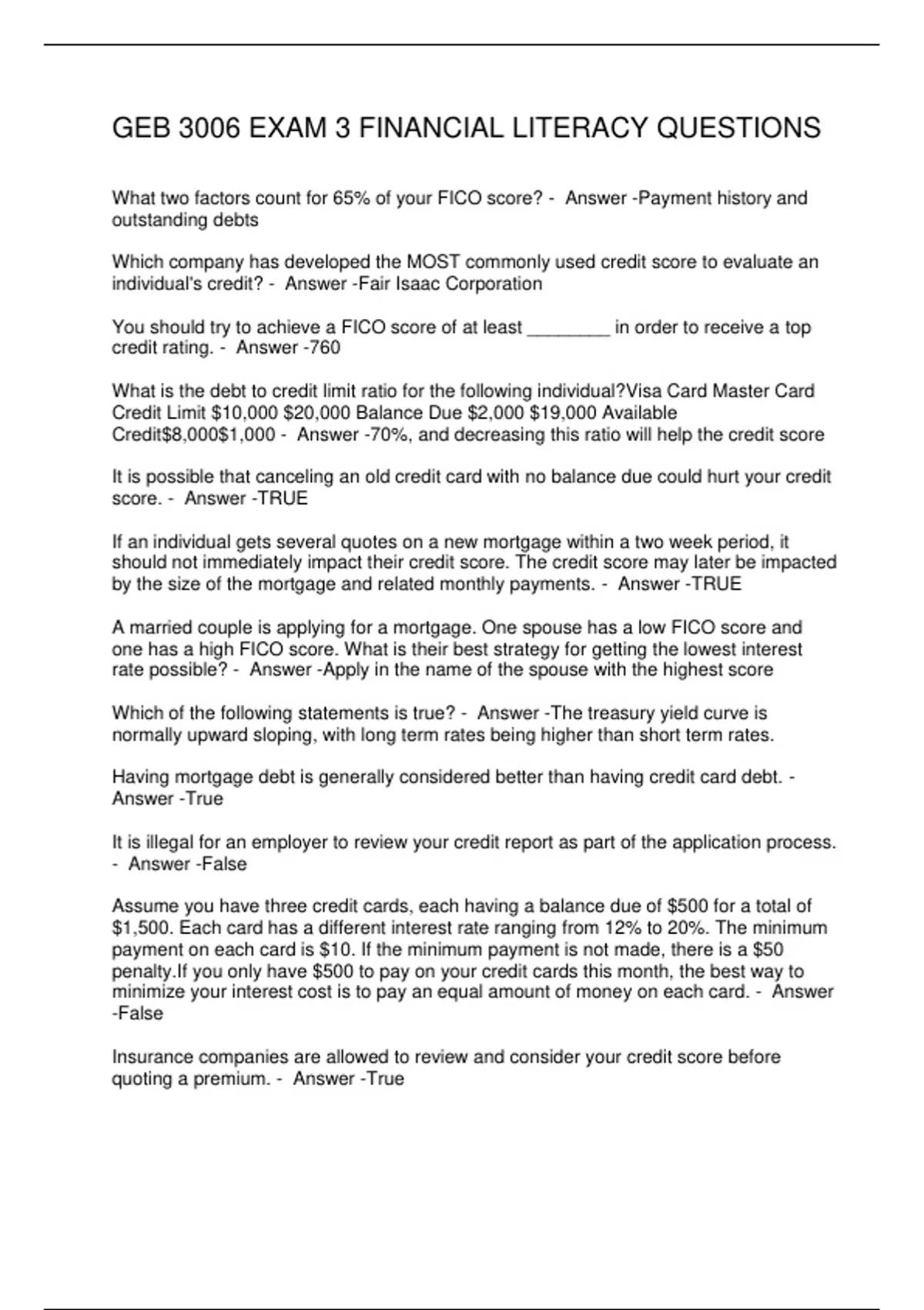 GEB 3006 EXAM 3 FINANCIAL LITERACY QUESTIONS