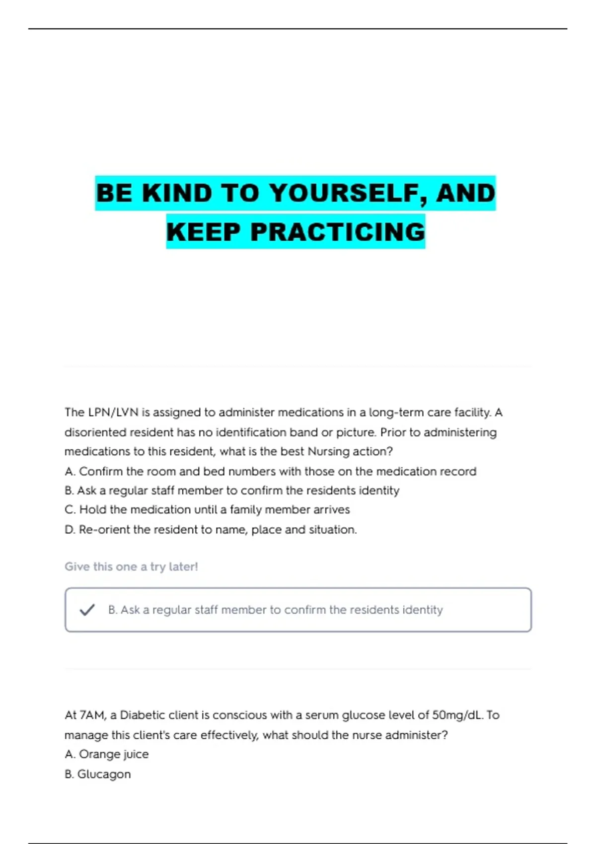 The LPN/LVN is assigned to administer medications in a long-term care facility. A