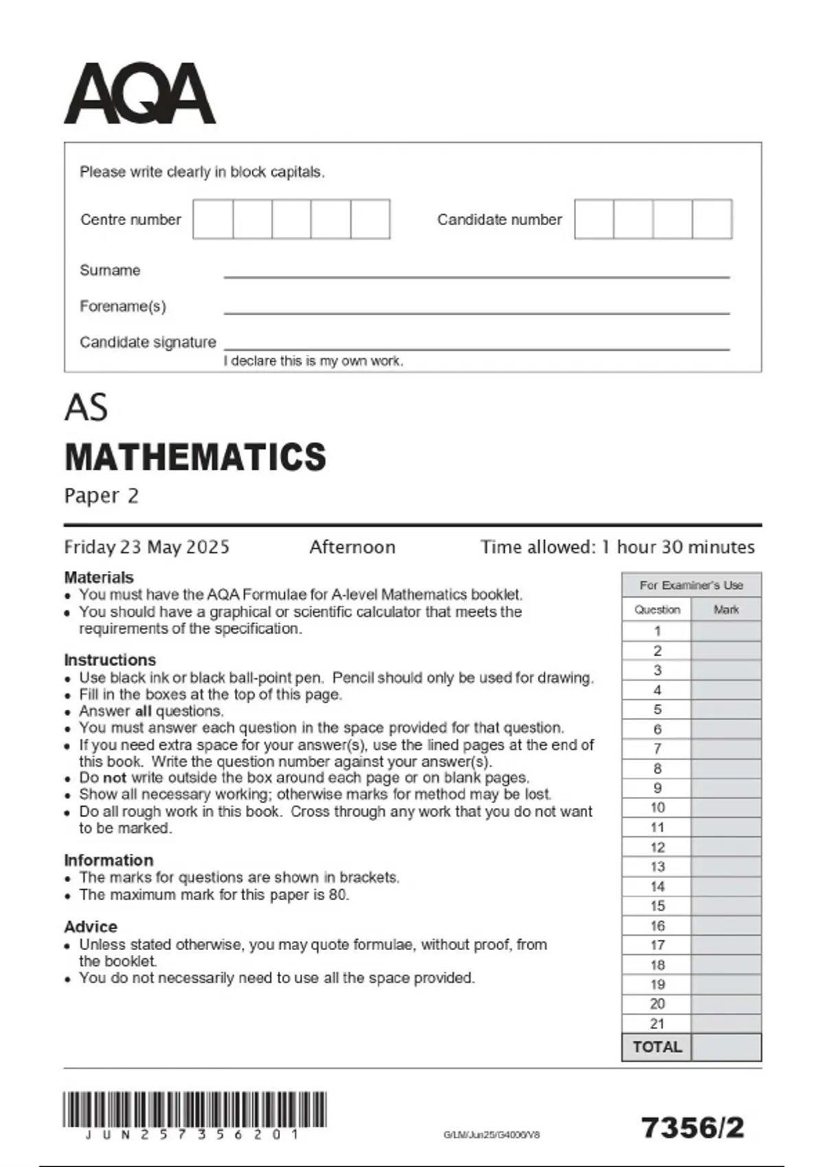 AQA As Level Mathematics Paper 2 2025 Question Paper