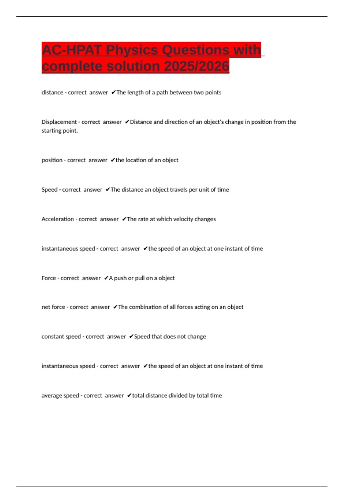 Displacement - correct answer ✔Distance and direction of an object's change in position from the