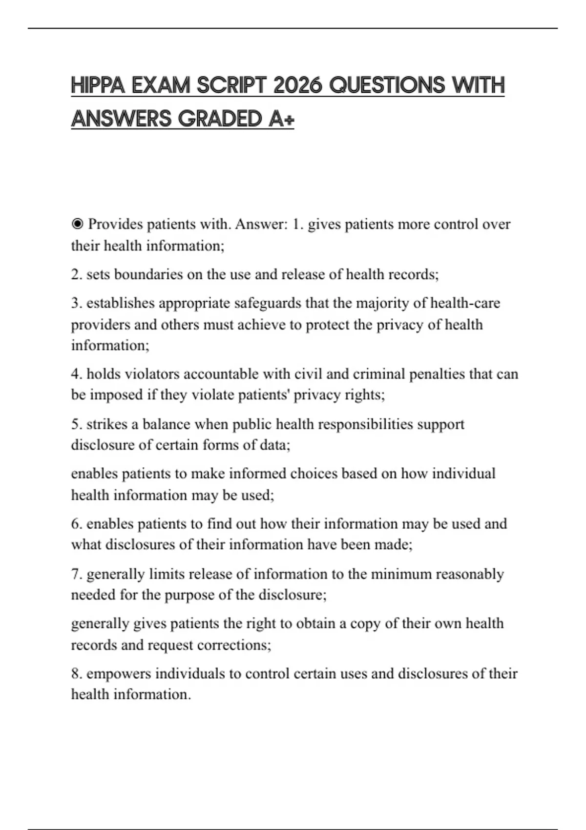 HIPPA EXAM SCRIPT 2026 QUESTIONS WITH ANSWERS GRADED A+