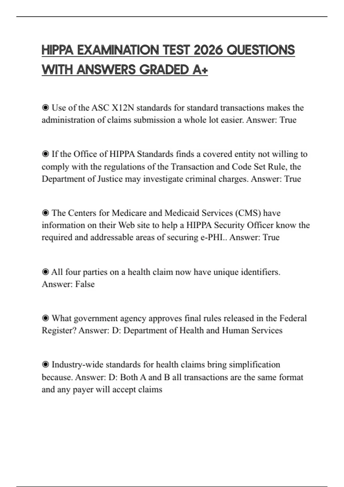 HIPPA EXAMINATION TEST 2026 QUESTIONS WITH ANSWERS GRADED A+