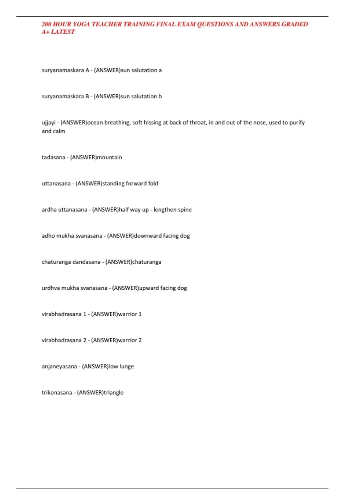 , 200 HOUR YOGA TEACHER TRAINING FINAL EXAM QUESTIONS AND ANSWERS GRADED