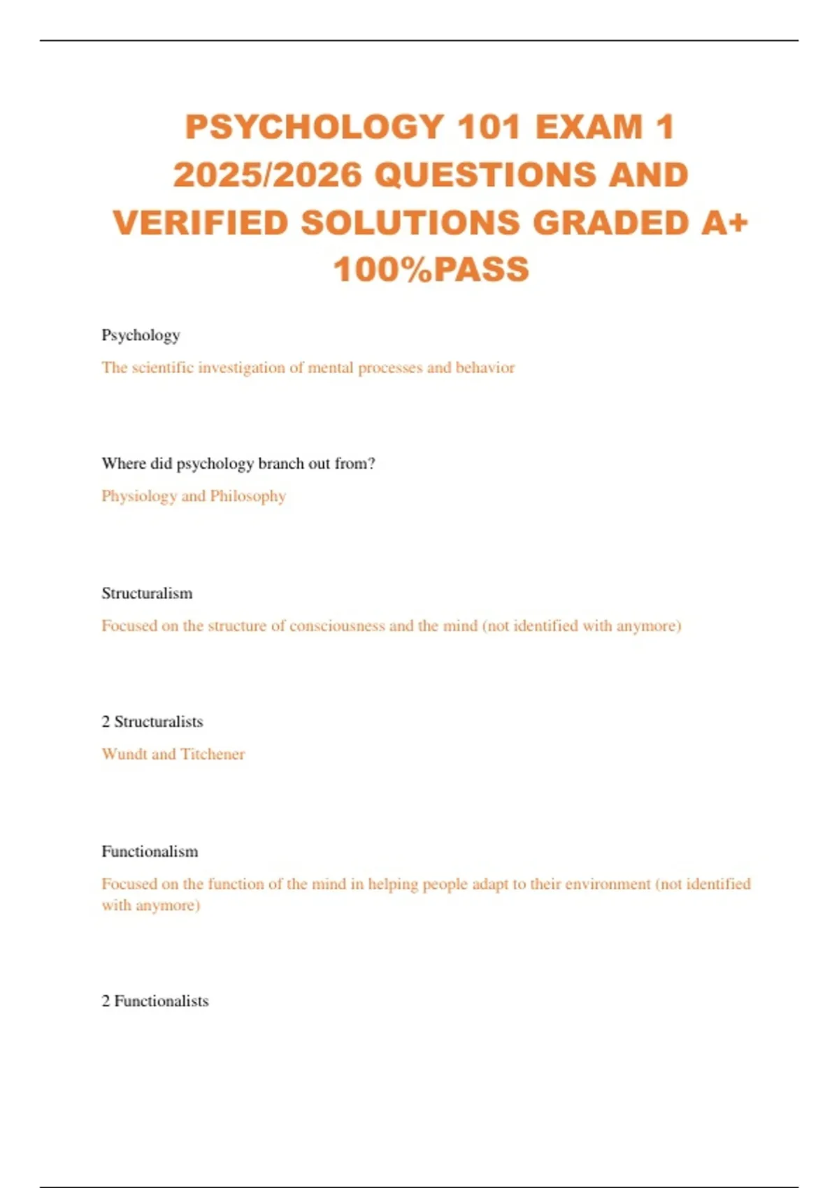 PSYCHOLOGY 101 EXAM 1 2025/2026 QUESTIONS AND VERIFIED SOLUTIONS GRADED A+ 100%PASS PSYCHOLOGY 101 EXAM 1 2025/2026 PSYCHOLOGY 101 EXAM 1 2025/2026 QUESTIONS AND VERIFIED SOLUTIONS