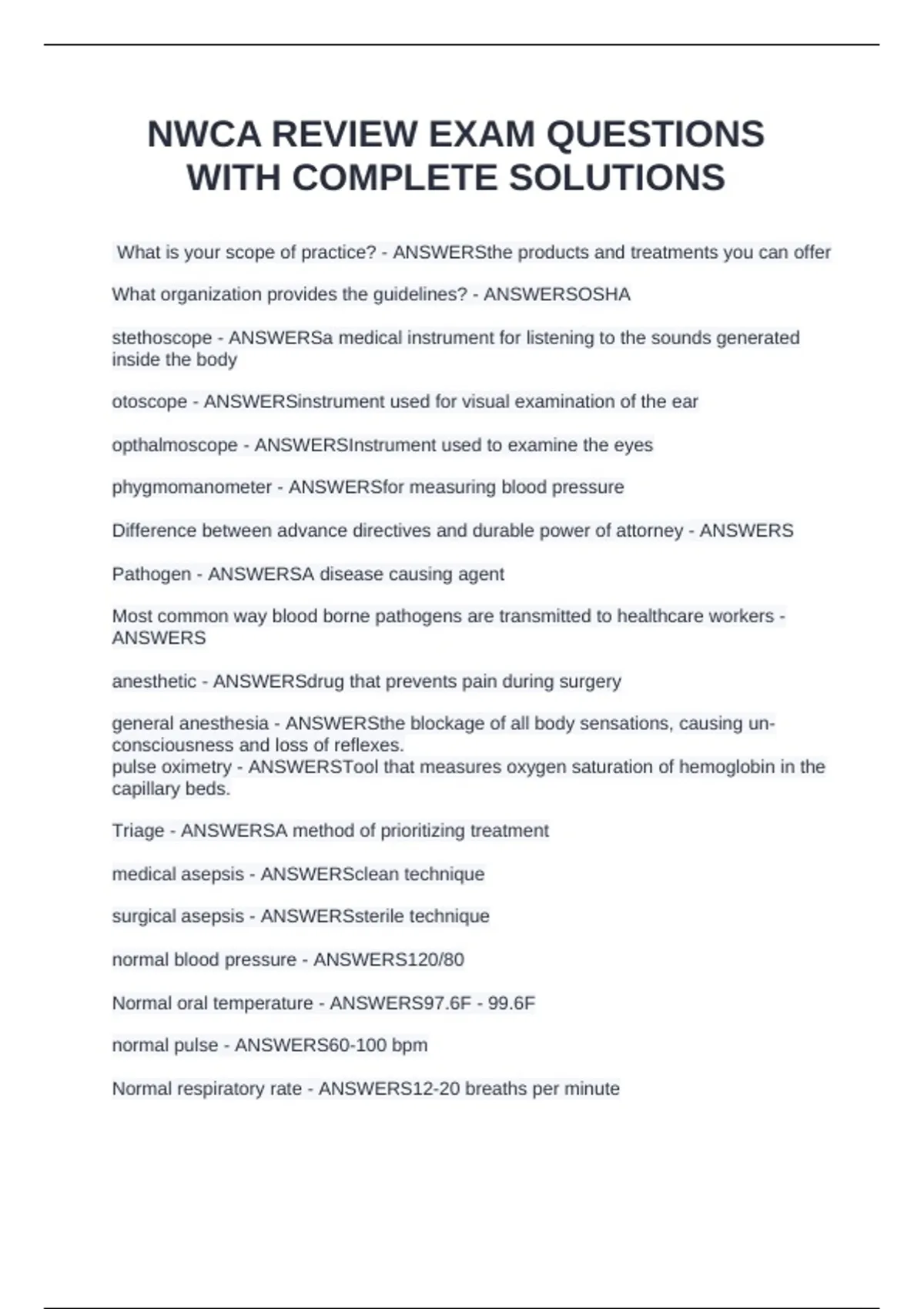 NWCA REVIEW EXAM QUESTIONS WITH COMPLETE SOLUTIONS