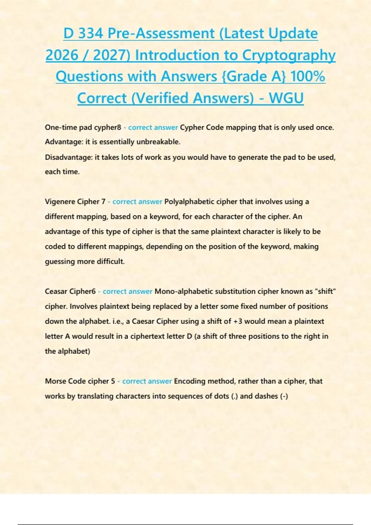D 334 Pre-Assessment (Latest Update ) Introduction to Cryptography Questions with Answers