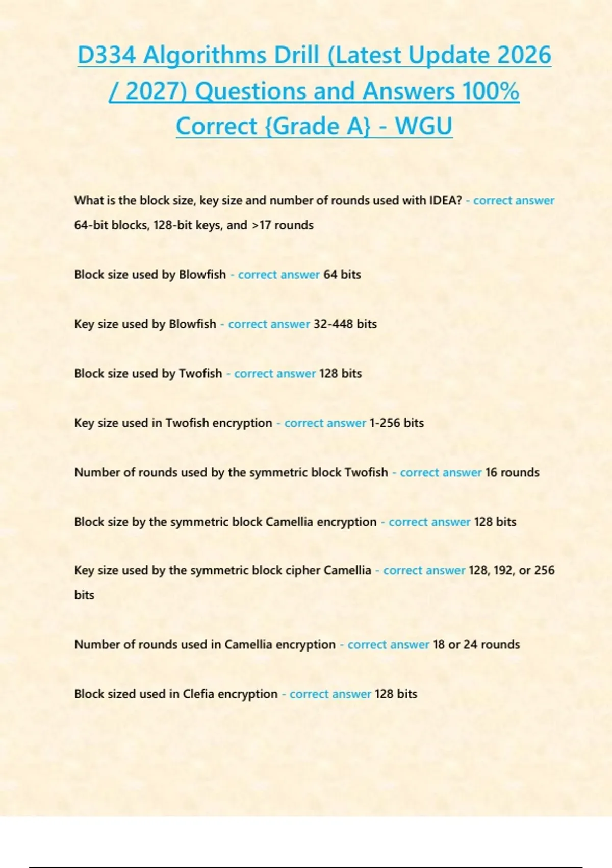 D334 Algorithms Drill (Latest Update 2026 / 2027) Questions and Answers 100% Correct {Grade A} - WGU What is the block size, key size and number of rounds used by the symmetric block cipher 3DES? - correct answer 64-bit blocks, 112-bit key, and 48 rounds Block size for Present - correct answer 64 bits Key size for Present - correct answer 80 or 128 bits Block size used by the symmetric block cipher RC5 - correct answer 32, 64, and 128 bits Number of rounds used with the lightweight symmetric block cipher Present - correct answer 32 rounds Key size used in Clefia encryption - correct answer 128, 192, or 256 bits RC4 key size when used with WPA - correct answer 128 bits Key size used with the symmetric stream cipher RC4 - correct answer Variable key size of 8-2048 (1-256 Bytes) Hash value output of MD4 - c