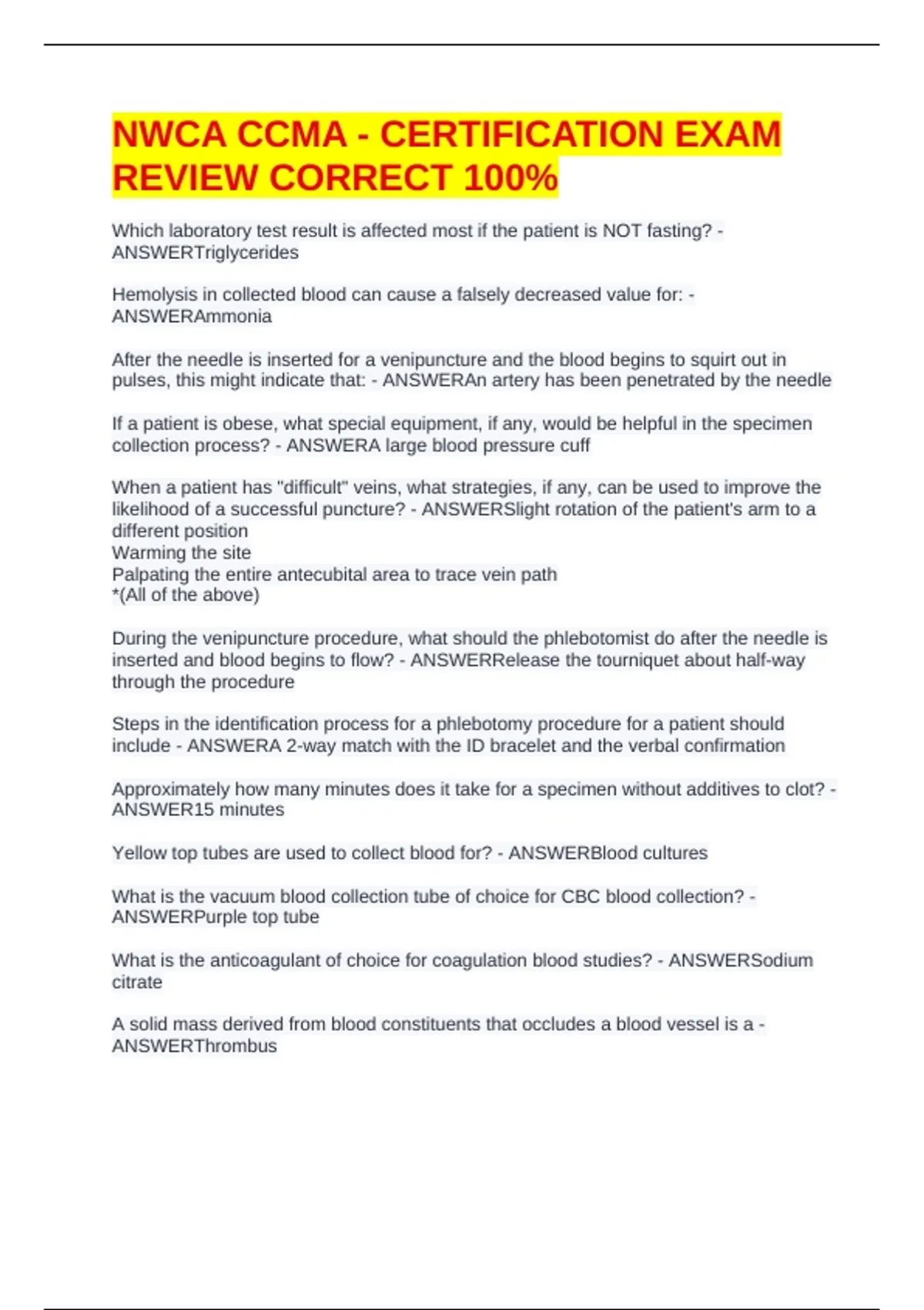 NWCA CCMA - CERTIFICATION EXAM REVIEW CORRECT 100%