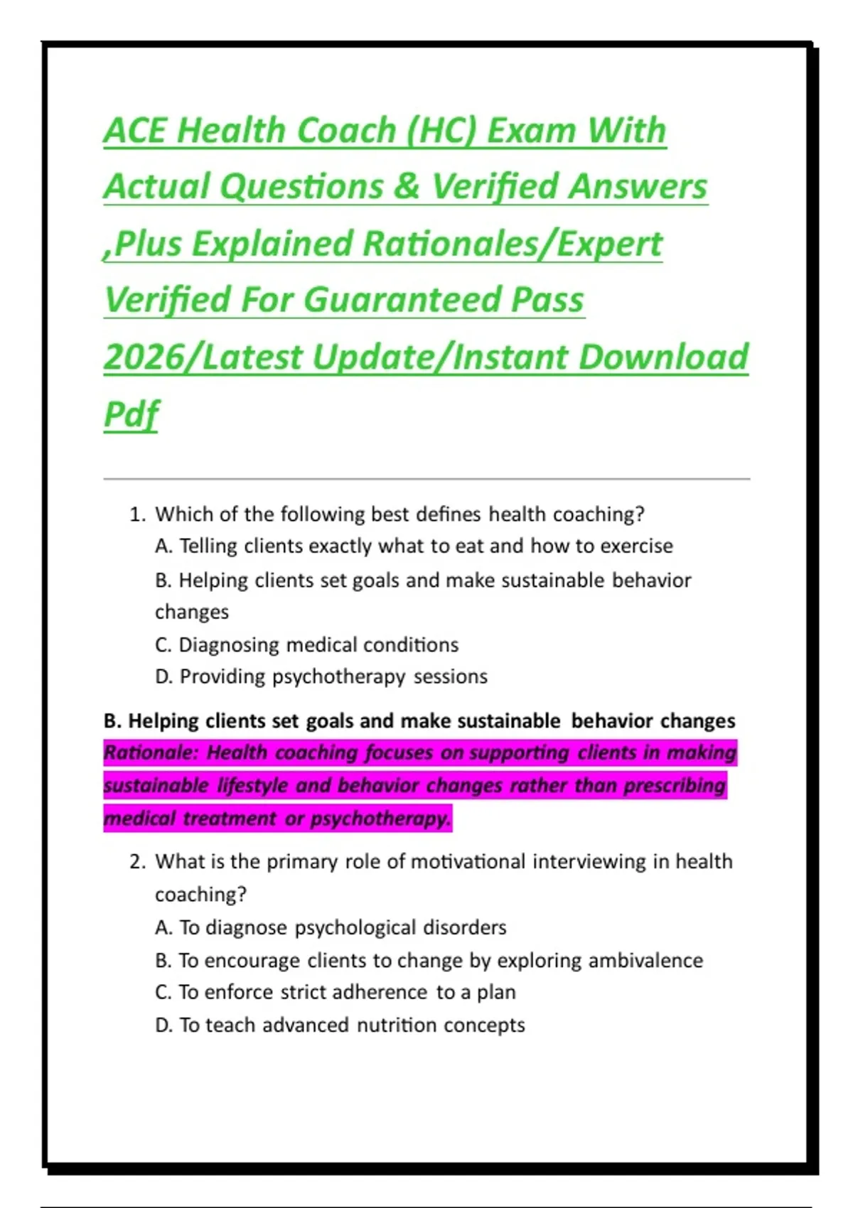 ACE Health Coach (HC) Exam With Actual Questions & Verified Answers ,Plus Explained Rationales/Expert Verified For Guaranteed Pass 2026/Latest Update/Instant Download Pdf