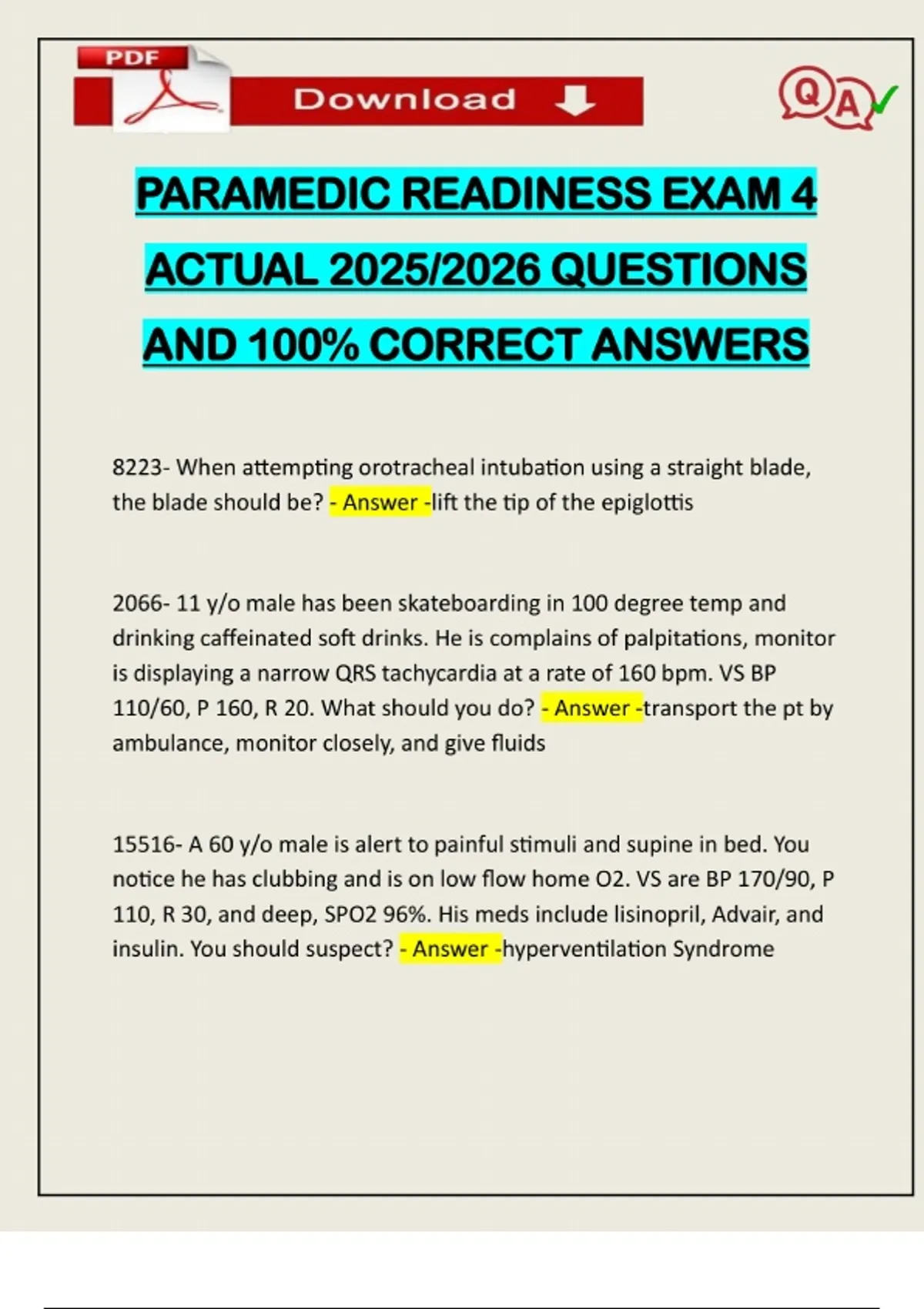 PARAMEDIC READINESS EXAM 4 ACTUAL 2025/2026 QUESTIONS AND 100% CORRECT ANSWERS 8223- When attempting orotracheal intubation using a straight blade, the blade should be? - Answer -lift the tip of the epiglottis 2066- 11 y/o male has been skateboarding in 100 degree temp and drinking caffeinated soft drinks. He is complains of palpitations, monitor is displaying a narrow QRS tachycardia at a rate of 160 bpm. VS BP 110/60, P 160, R 20. What should you do? - Answer -transport the pt by ambulance, monitor closely, and give fluids 15516- A 60 y/o male is alert to painful stimuli and supine in bed. You notice he has clubbing and is on low flow home O2. VS are BP 170/90, P 110, R 30, and deep, SPO2 96%. His meds include lisinopril, Advair, and insulin. You should suspect? - Answer -hyperventilation SyndromeNeed assistance on Online classes, Exams & Assignments? Reach out for instant help!! Full Course Assistance, Plagiarism-free Essay Writing, Research Paper, Dissertation, Discussion Posts, etc…. Confidential & Secure services. Tutors are available for all subjects! Email now at: 15181- Unresponsive 26 y/o motorcyclist was involved in a car crash, he has snoring respirations at 10 and unequal chest rise. You should? - Answer -ventilate with a bag valve mask 15921- What is the purpose of surfactant? - Answer -to relieve pressure from the alveolar walls 9491- 61 y/o Arabic speaking female is pale, d