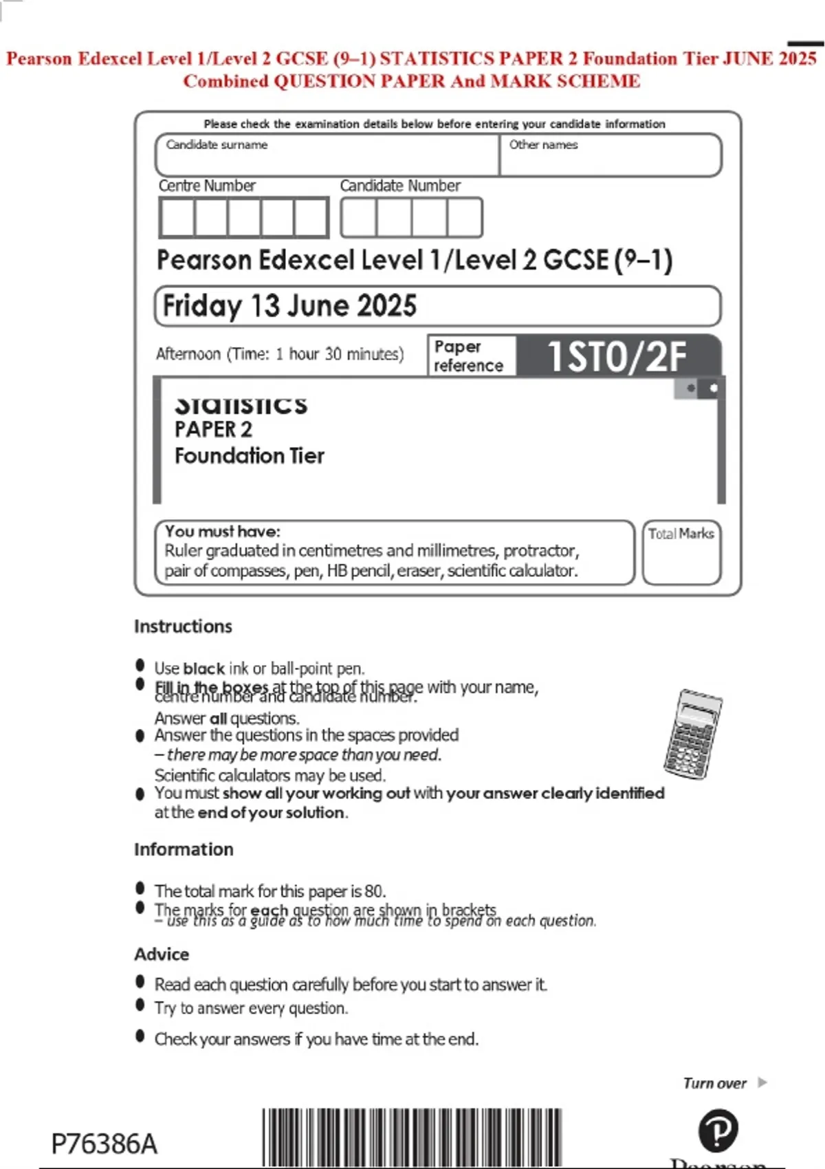 Pearson Edexcel Level 1/Level 2 GCSE (9–1) STATISTICS PAPER 2 Foundation Tier JUNE 2025 Combined QUESTION PAPER And MARK SCHEME