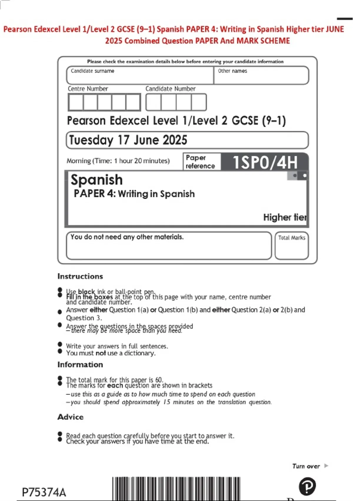 Pearson Edexcel Level 1/Level 2 GCSE (9–1) Spanish PAPER 4: Writing in Spanish Higher tier JUNE 2025 Combined Question PAPER And MARK SCHEME