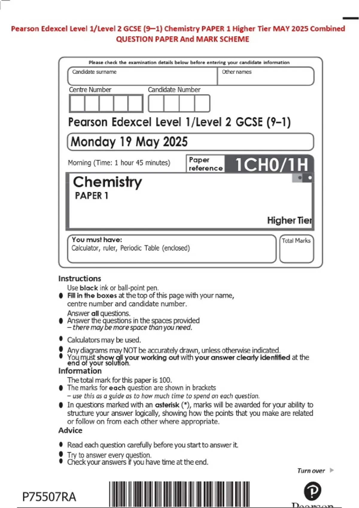 Pearson Edexcel Level 1/Level 2 GCSE (9–1) Chemistry PAPER 1 Higher Tier MAY 2025 Combined QUESTION PAPER And MARK SCHEME