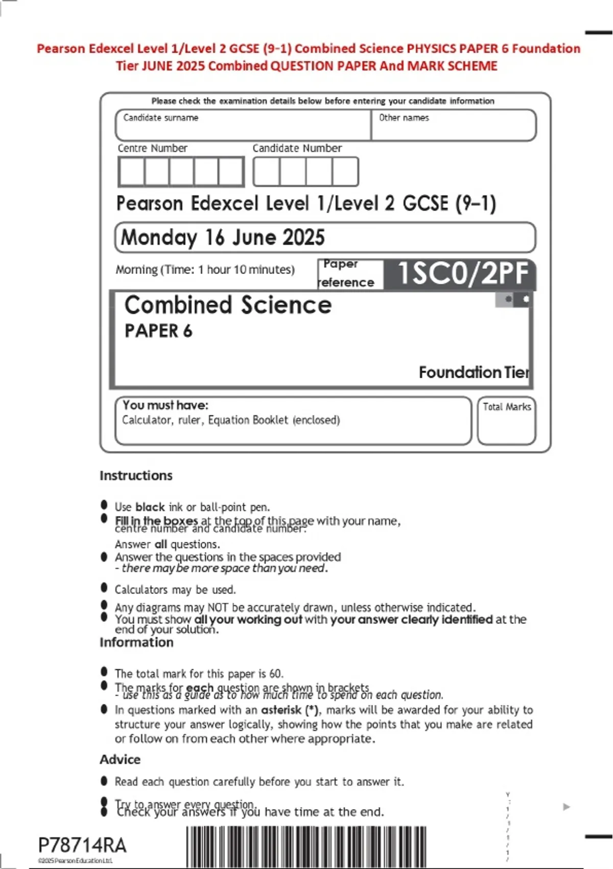 Pearson Edexcel Level 1/Level 2 GCSE (9–1) Combined Science PHYSICS PAPER 6 Foundation Tier JUNE 2025 Combined QUESTION PAPER And MARK SCHEME