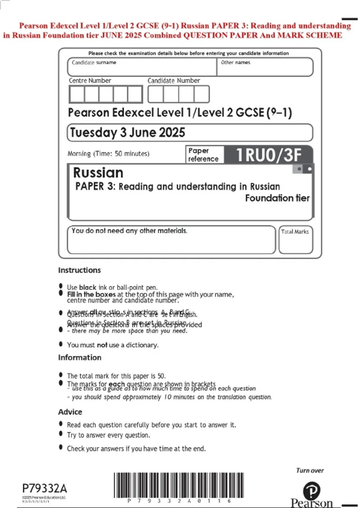 Pearson Edexcel Level 1/Level 2 GCSE (9–1) Russian PAPER 3: Reading and understanding in Russian Foundation tier JUNE 2025 Combined QUESTION PAPER And MARK SCHEME