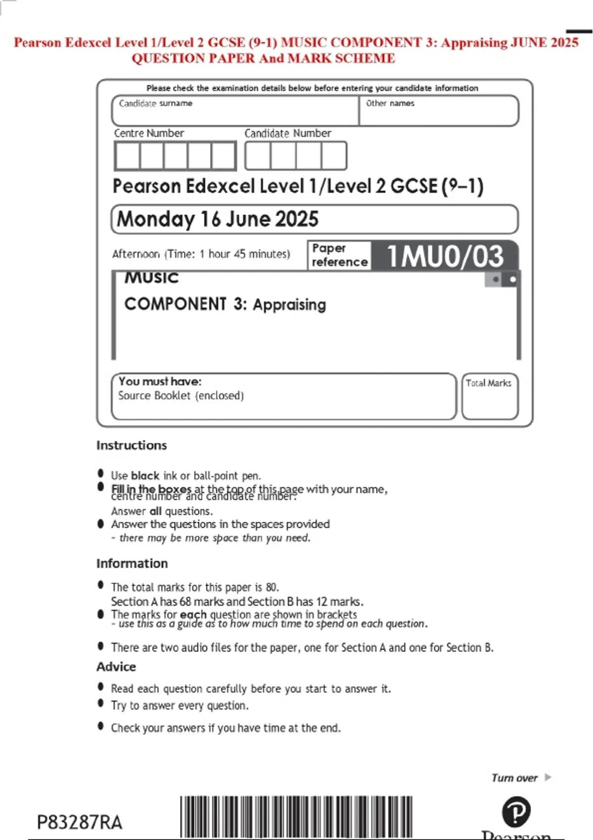 Pearson Edexcel Level 1/Level 2 GCSE (9–1) MUSIC COMPONENT 3: Appraising JUNE 2025 QUESTION PAPER And MARK SCHEME