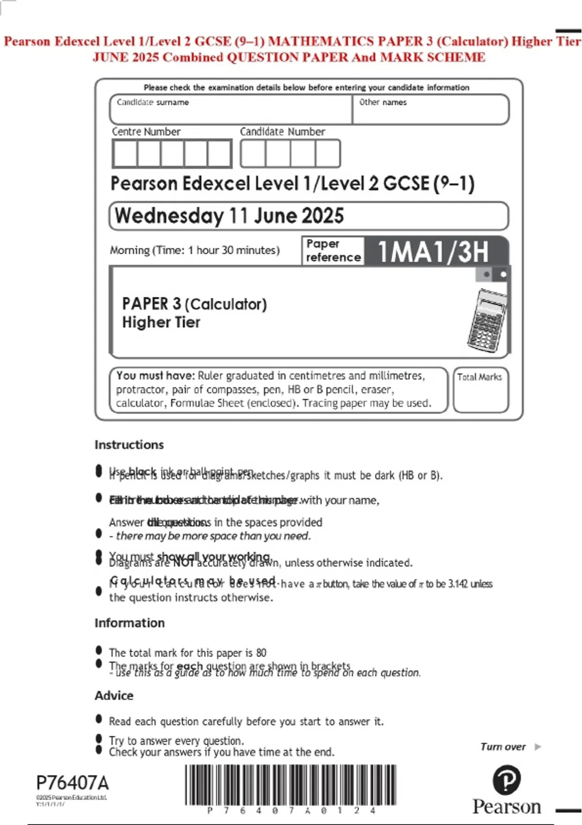 Pearson Edexcel Level 1/Level 2 GCSE (9–1) MATHEMATICS PAPER 3 (Calculator) Higher Tier JUNE 2025 Combined QUESTION PAPER And MARK SCHEME