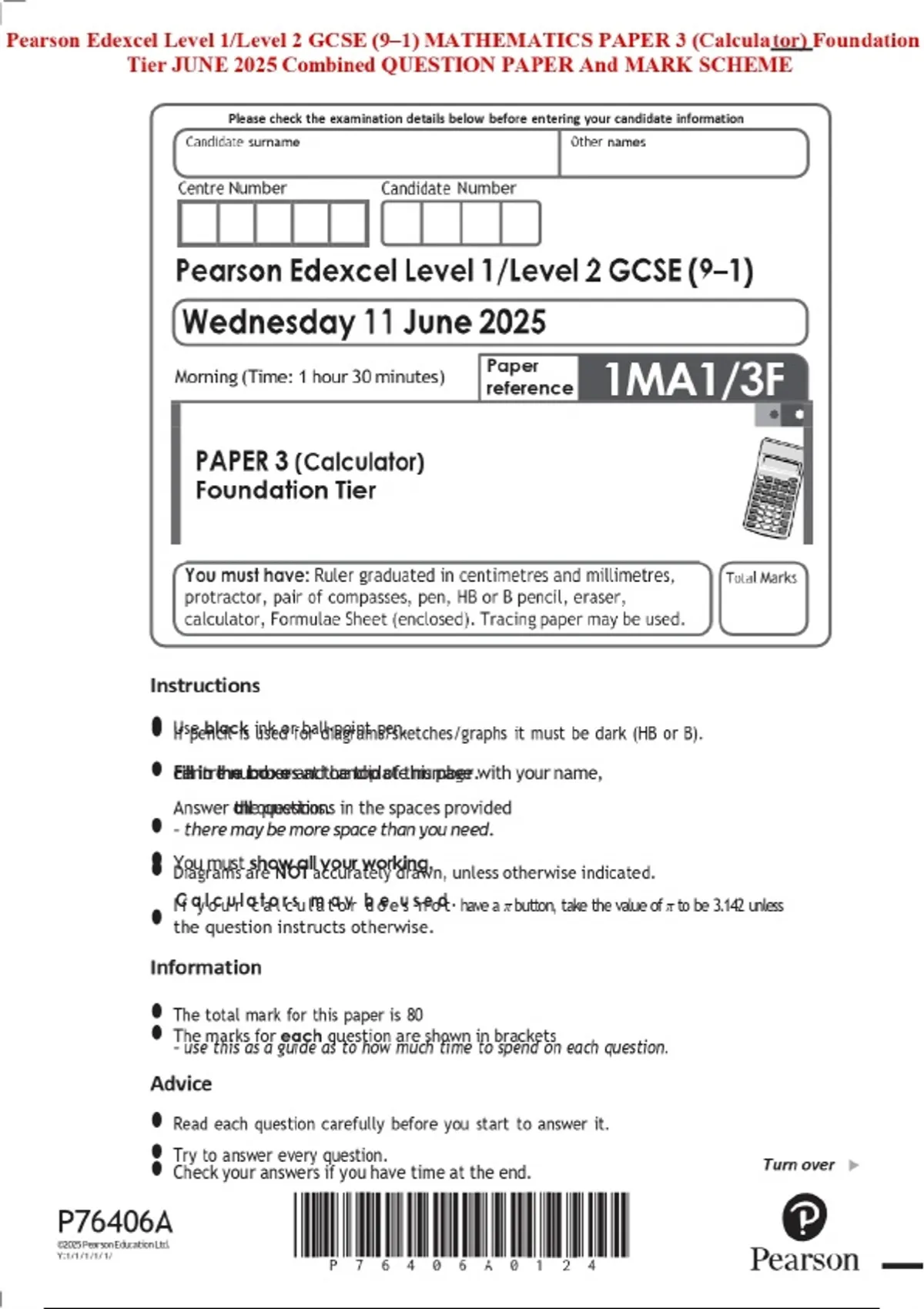 Pearson Edexcel Level 1/Level 2 GCSE (9–1) MATHEMATICS PAPER 3 (Calculator) Foundation Tier JUNE 2025 Combined QUESTION PAPER And MARK SCHEME