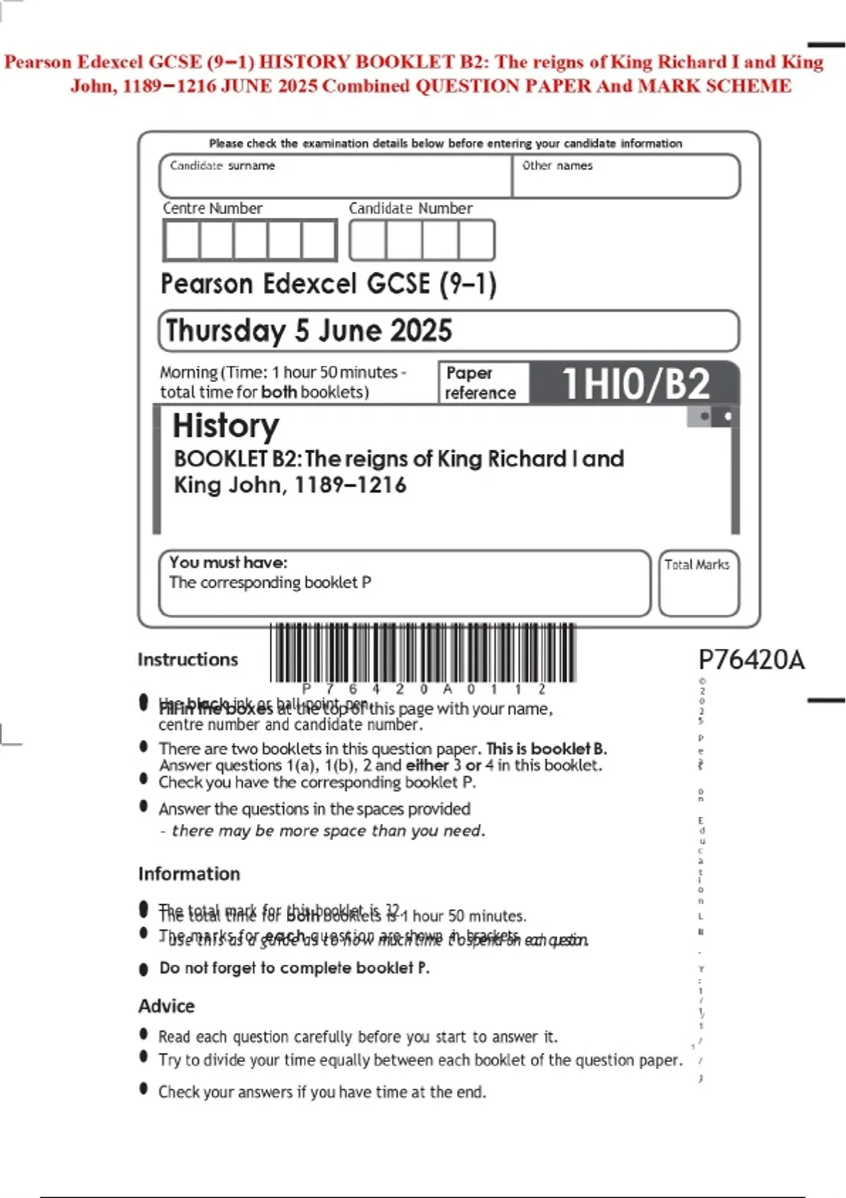 Pearson Edexcel GCSE (9–1) HISTORY BOOKLET B2: The reigns of King Richard I and King John, 1189–1216 JUNE 2025 Combined QUESTION PAPER And MARK SCHEME