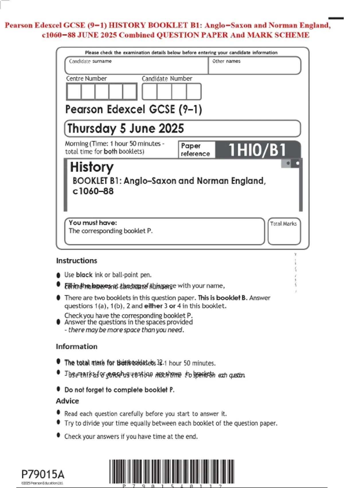 Pearson Edexcel GCSE (9–1) HISTORY BOOKLET B1: Anglo–Saxon and Norman England, c1060–88 JUNE 2025 Combined QUESTION PAPER And MARK SCHEME