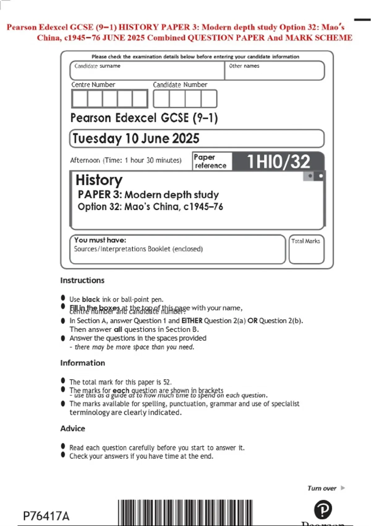 Pearson Edexcel GCSE (9–1) HISTORY PAPER 3: Modern depth study Option 32: Mao’s China, c1945–76 JUNE 2025 Combined QUESTION PAPER And MARK SCHEME