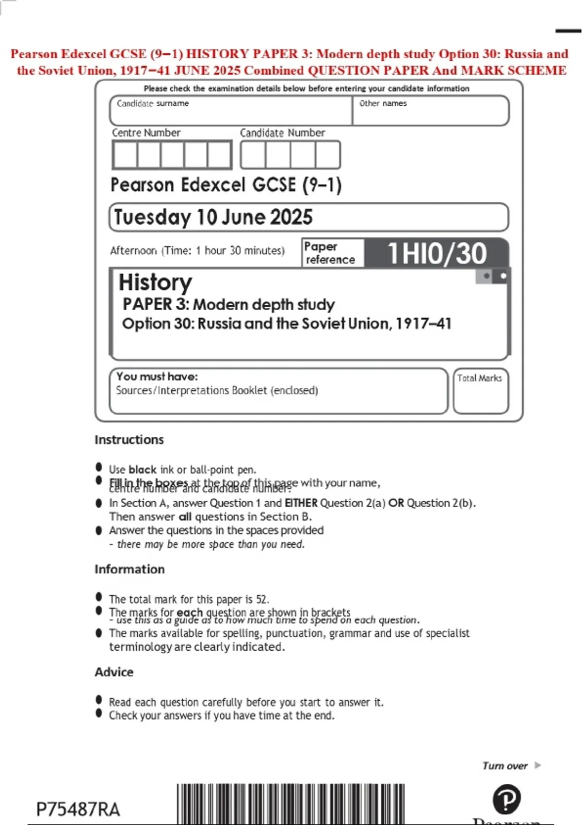 Pearson Edexcel GCSE (9–1) HISTORY PAPER 3: Modern depth study Option 30: Russia and the Soviet Union, 1917–41 JUNE 2025 Combined QUESTION PAPER And MARK SCHEME