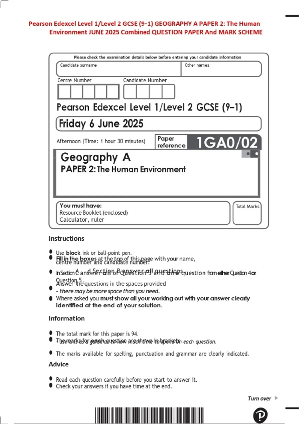 Pearson Edexcel Level 1/Level 2 GCSE (9–1) GEOGRAPHY A PAPER 2: The Human Environment JUNE 2025 Combined QUESTION PAPER And MARK SCHEME