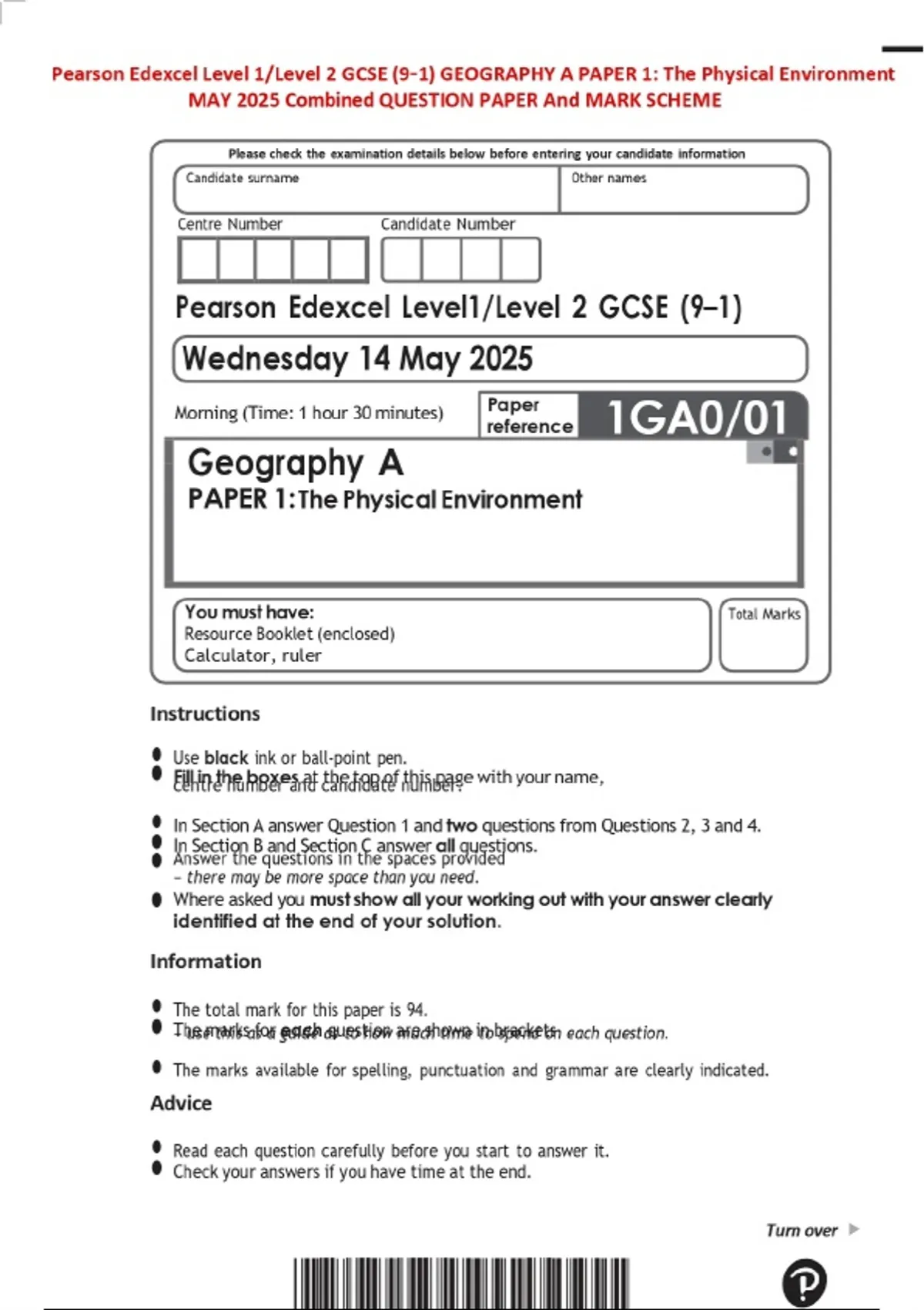 Pearson Edexcel Level 1/Level 2 GCSE (9–1) GEOGRAPHY A PAPER 1: The Physical Environment MAY 2025 Combined QUESTION PAPER And MARK SCHEME