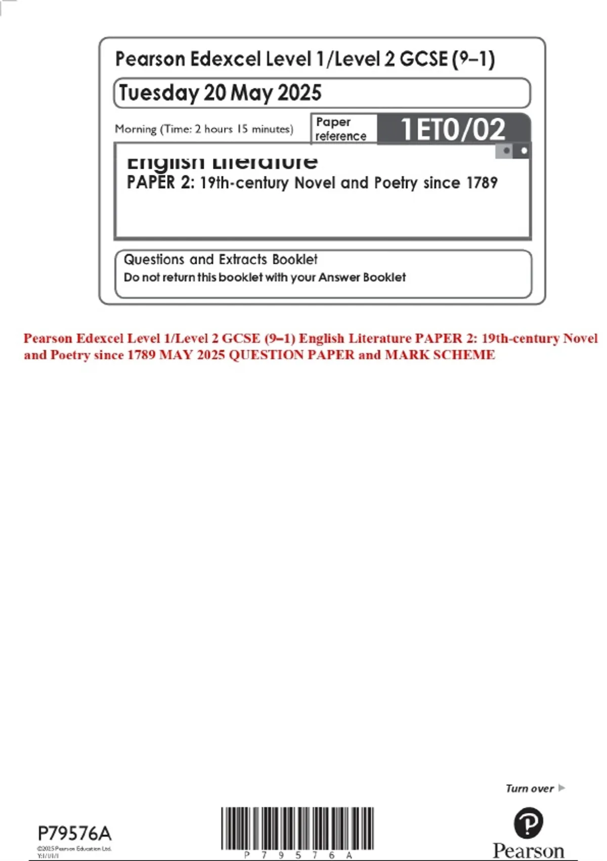 Pearson Edexcel Level 1/Level 2 GCSE (9–1) English Literature PAPER 2: 19th-century Novel and Poetry since 1789 MAY 2025 QUESTION PAPER and MARK SCHEME