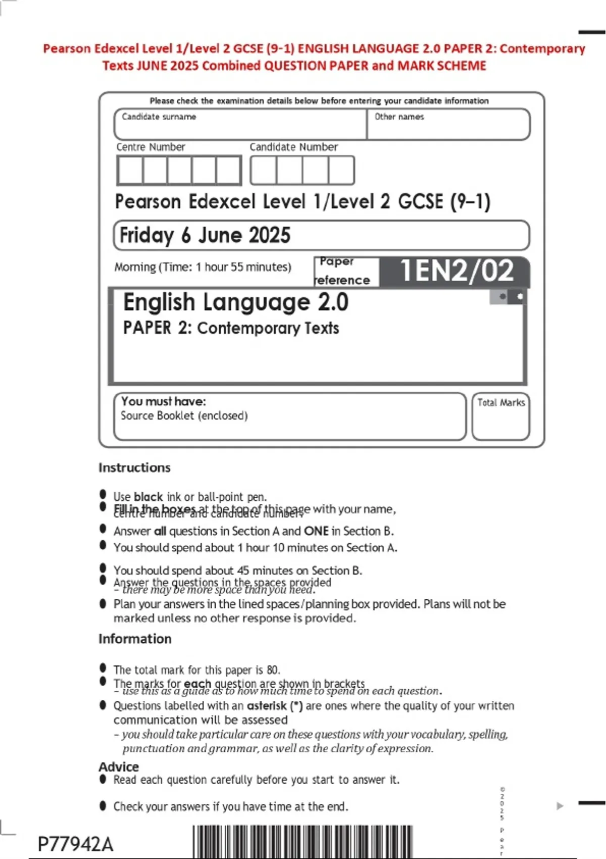 Pearson Edexcel Level 1/Level 2 GCSE (9–1) ENGLISH LANGUAGE 2.0 PAPER 2: Contemporary Texts JUNE 2025 Combined QUESTION PAPER and MARK SCHEME