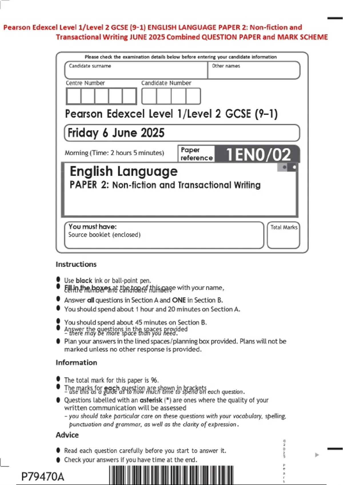 Pearson Edexcel Level 1/Level 2 GCSE (9–1) ENGLISH LANGUAGE PAPER 2: Non-fiction and Transactional Writing JUNE 2025 Combined QUESTION PAPER and MARK SCHEME