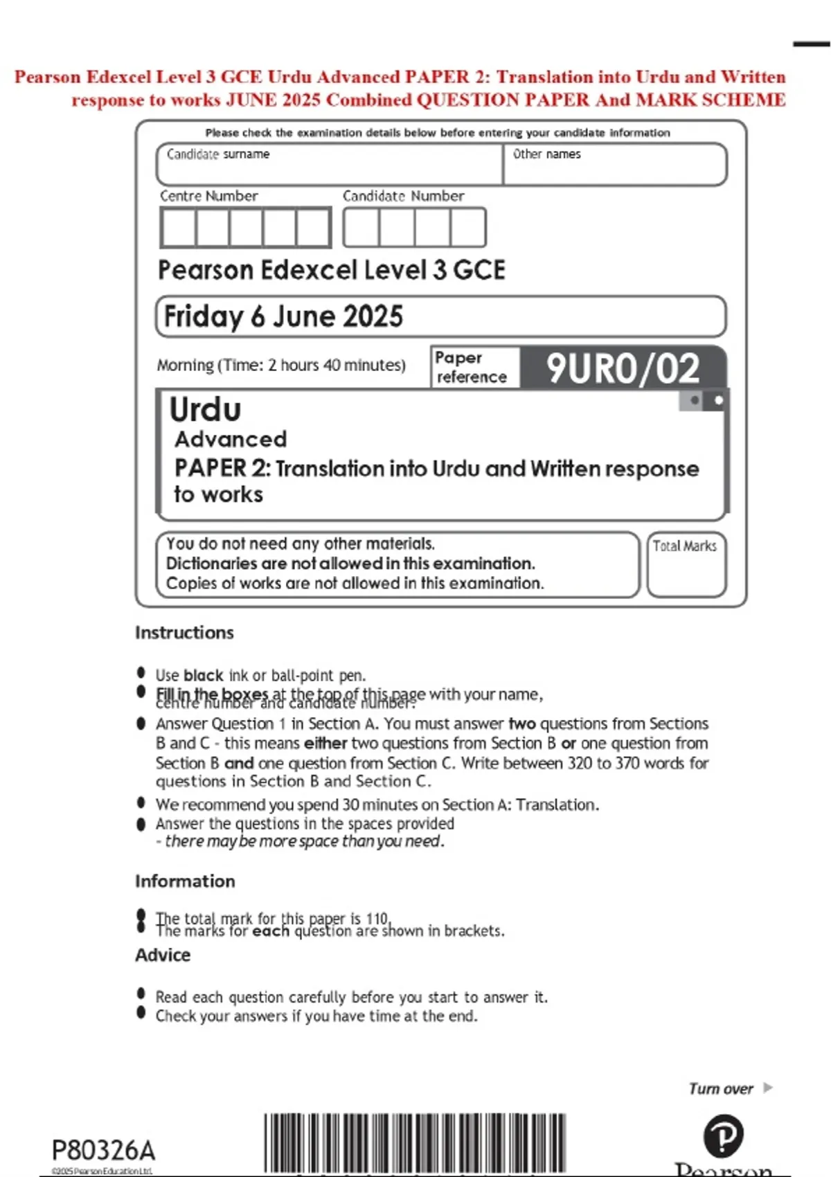 Pearson Edexcel Level 3 GCE Urdu Advanced PAPER 2: Translation into Urdu and Written response to works JUNE 2025 Combined QUESTION PAPER And MARK SCHEME