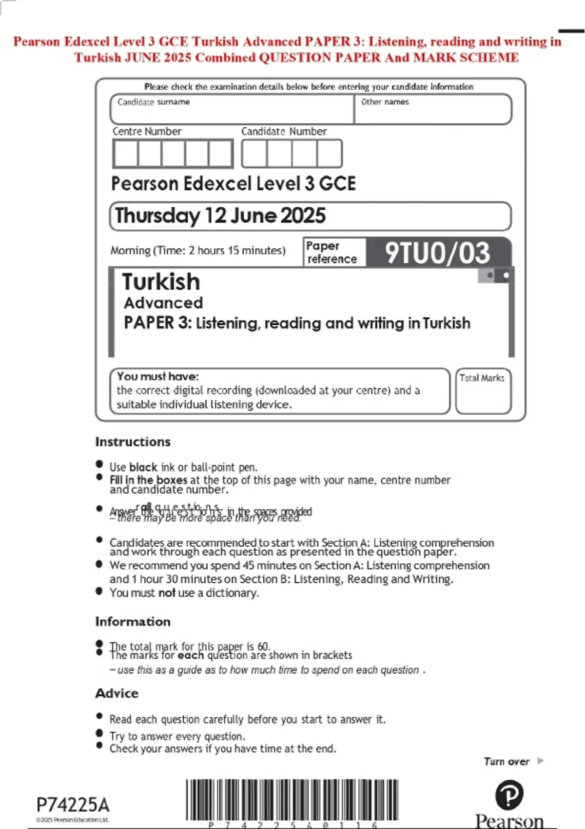 Pearson Edexcel Level 3 GCE Turkish Advanced PAPER 3: Listening, reading and writing in Turkish JUNE 2025 Combined QUESTION PAPER And MARK SCHEME