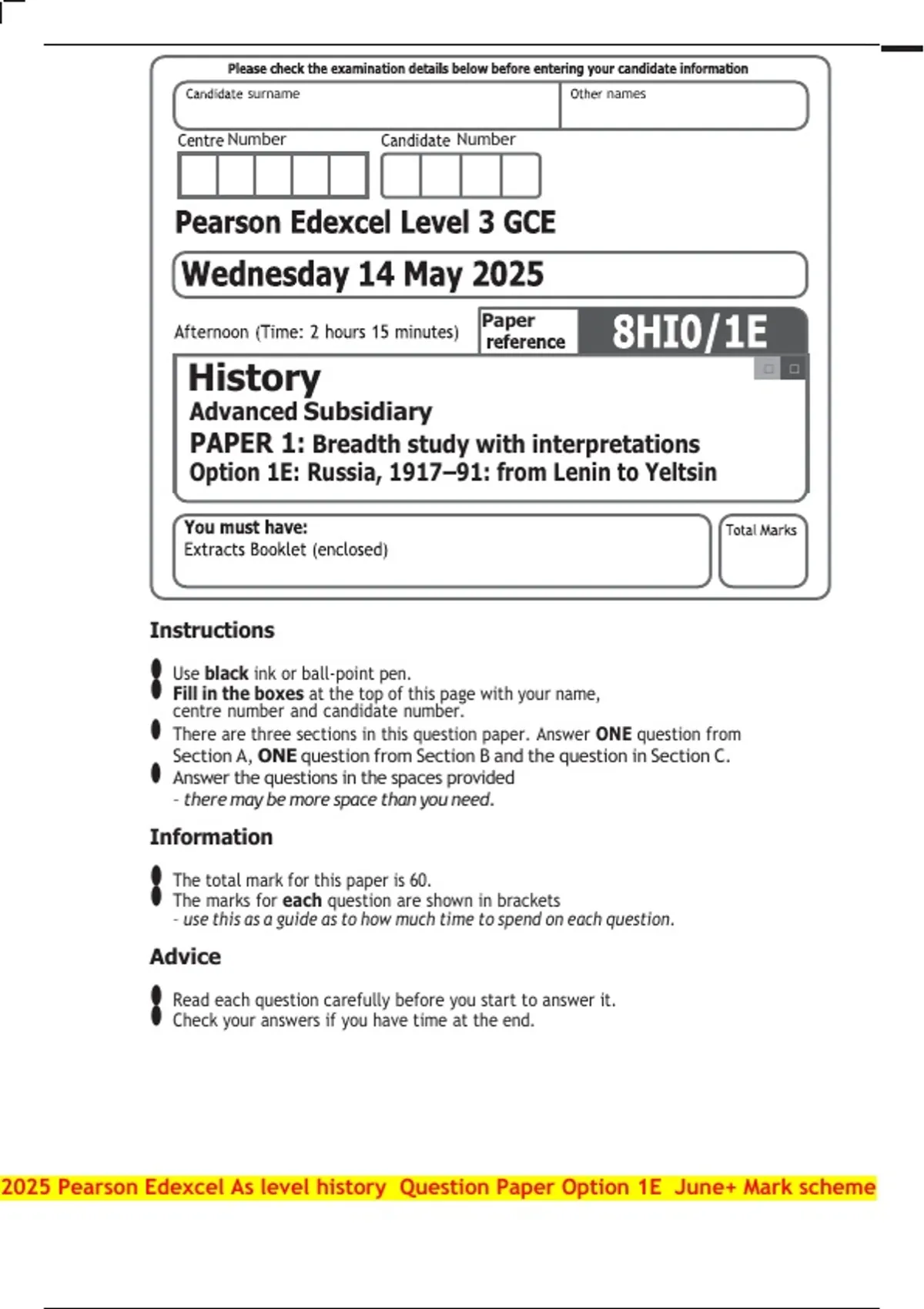 2025 Pearson Edexcel As level history Question Paper Option 1E June+ Mark scheme