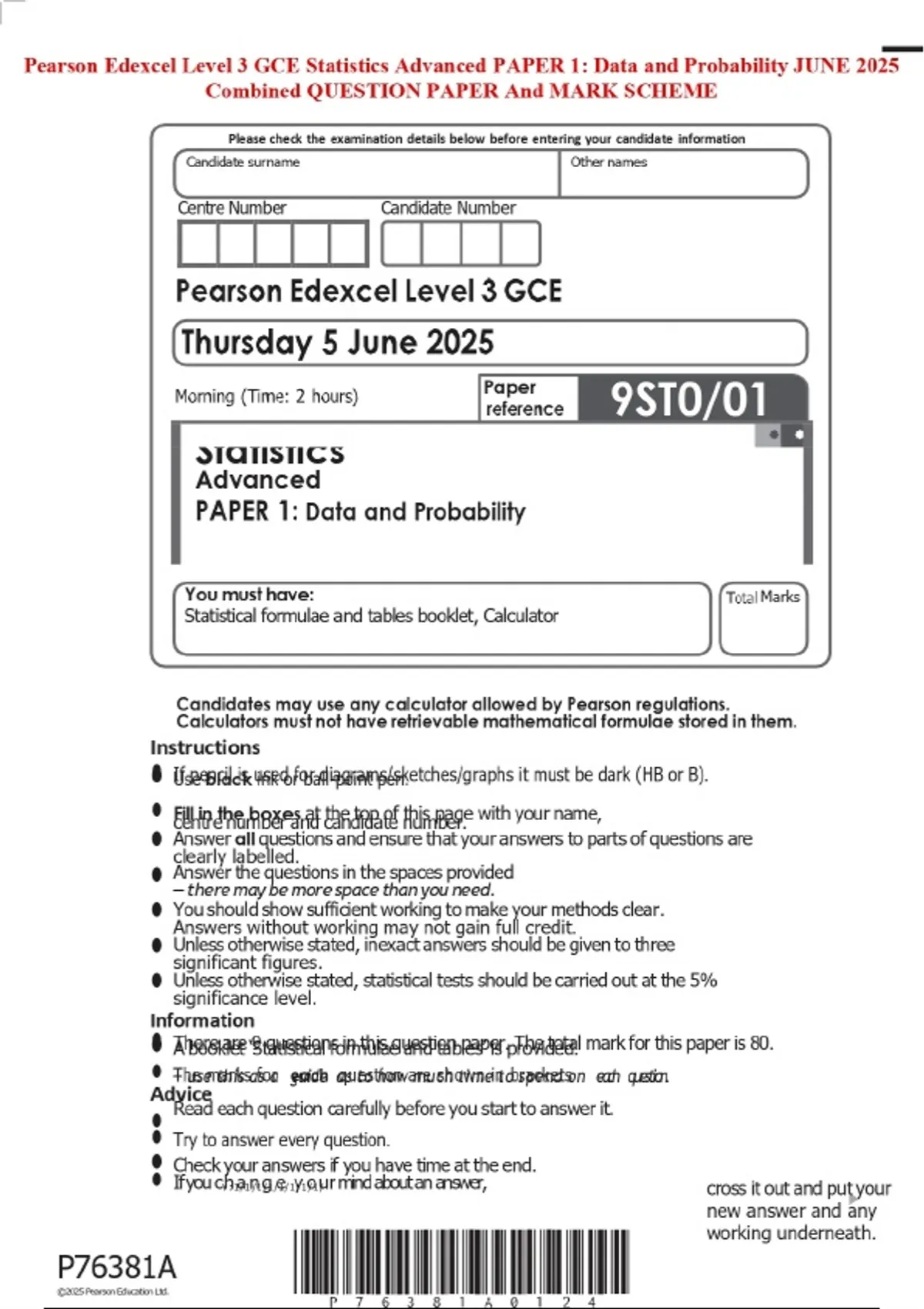 Pearson Edexcel Level 3 GCE Statistics Advanced PAPER 1: Data and Probability JUNE 2025 Combined QUESTION PAPER And MARK SCHEME