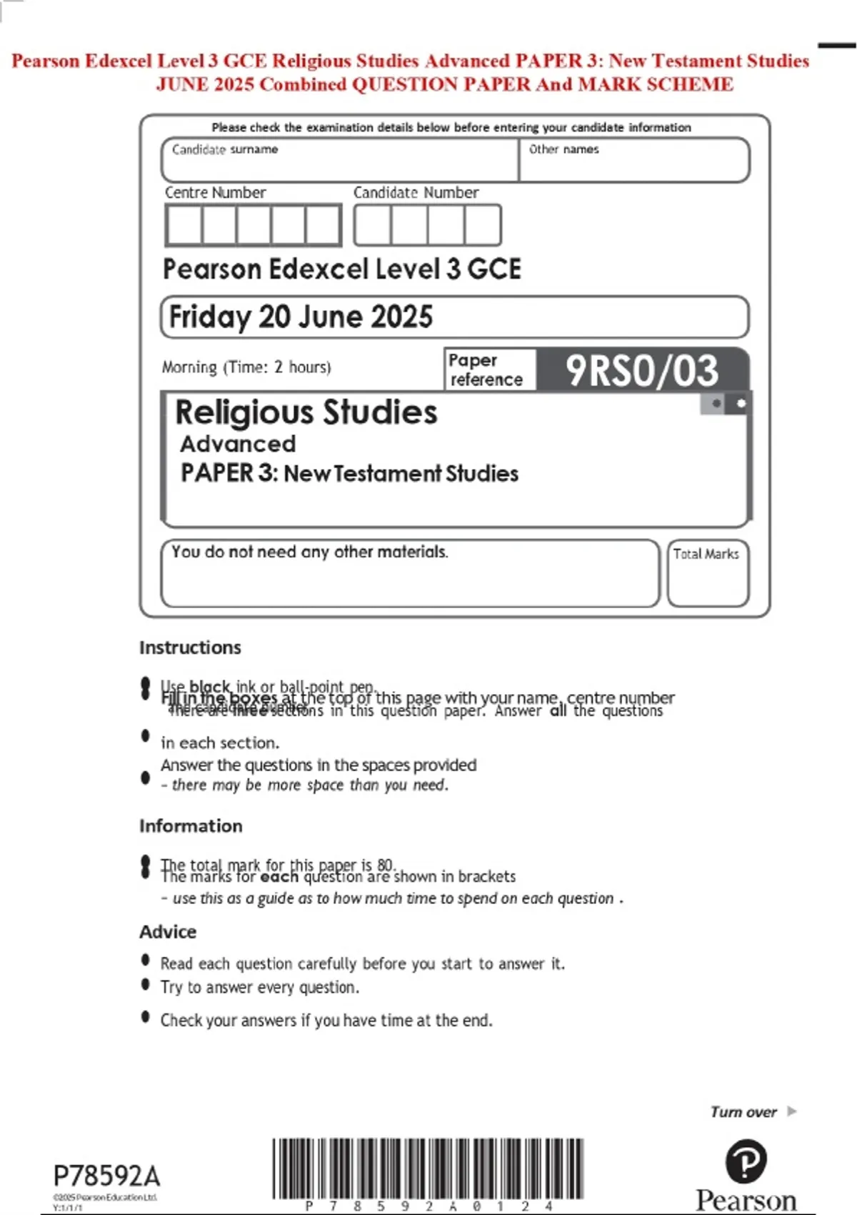 Pearson Edexcel Level 3 GCE Religious Studies Advanced PAPER 3: New Testament Studies JUNE 2025 Combined QUESTION PAPER And MARK SCHEME