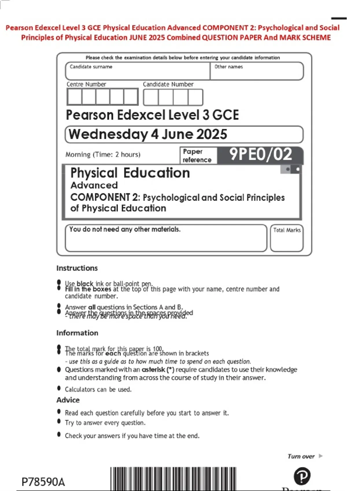 Pearson Edexcel Level 3 GCE Physical Education Advanced COMPONENT 2: Psychological and Social Principles of Physical Education JUNE 2025 Combined QUESTION PAPER And MARK SCHEME